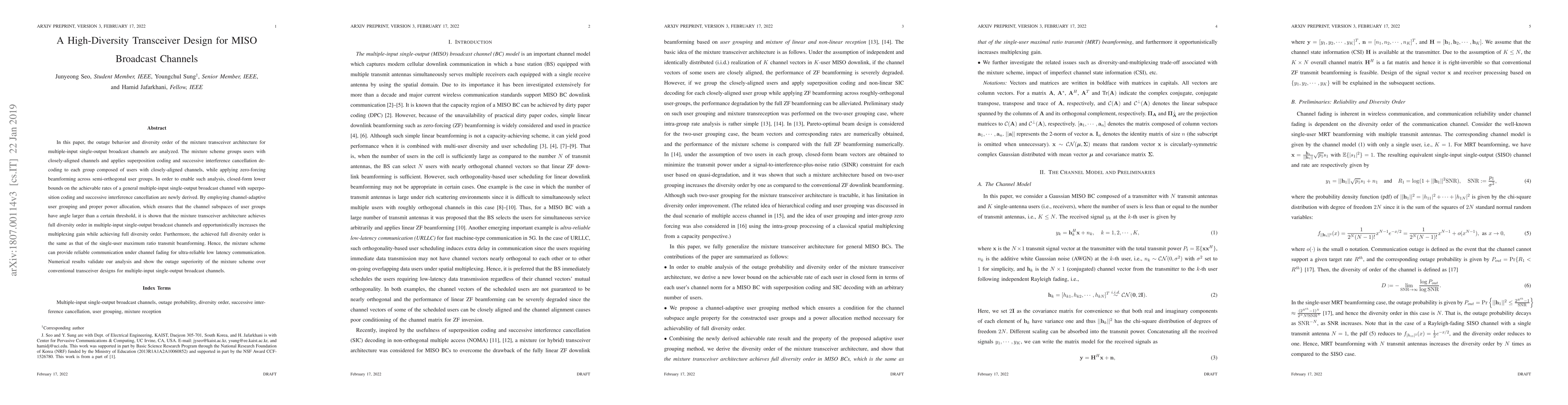 This paper analyzes a high-diversity mixture transceiver design for MISO broadcast channels, achieving full diversity order and multiplexing gain through adaptive user grouping and power allocation. Numerical results demonstrate its superior outage performance compared to conventional designs.