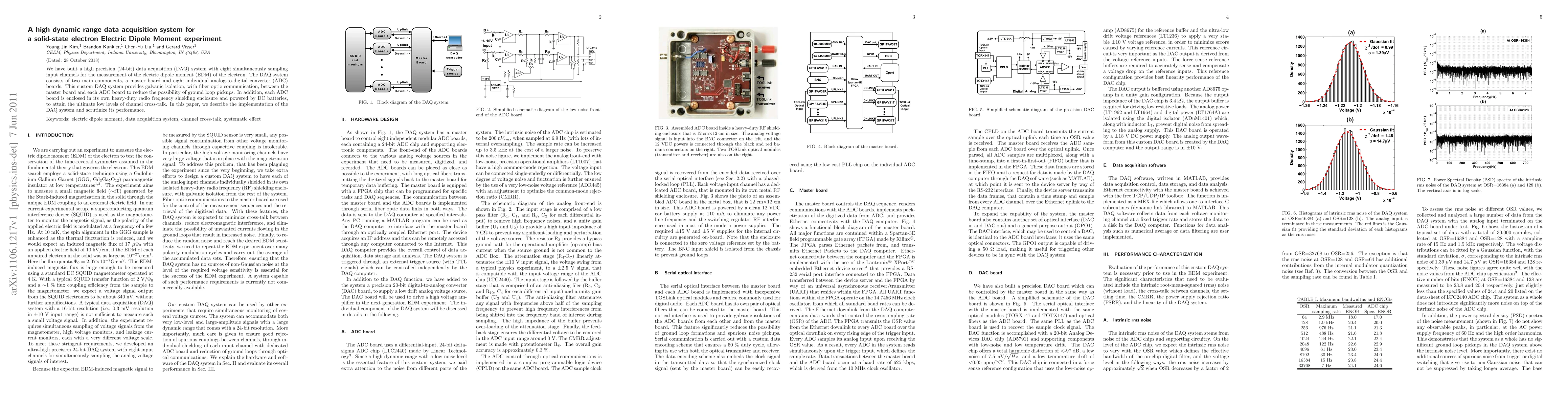 We have built a high precision (24-bit) data acquisition (DAQ) system with eight simultaneously sampling input channels for the measurement of the electric dipole moment (EDM) of the electron. The DAQ system consists of two main components, a master board and eight individual analog-to-digital converter (ADC) boards. This custom DAQ system provides galvanic isolation, with fiber optic communication, between the master board and each ADC board to reduce the possibility of ground loop pickups. In addition, each ADC board is enclosed in its own heavy-duty radio frequency shielding enclosure and powered by DC batteries, to attain the ultimate low levels of channel cross-talk. In this paper, we describe the implementation of the DAQ system and scrutinize its performance.