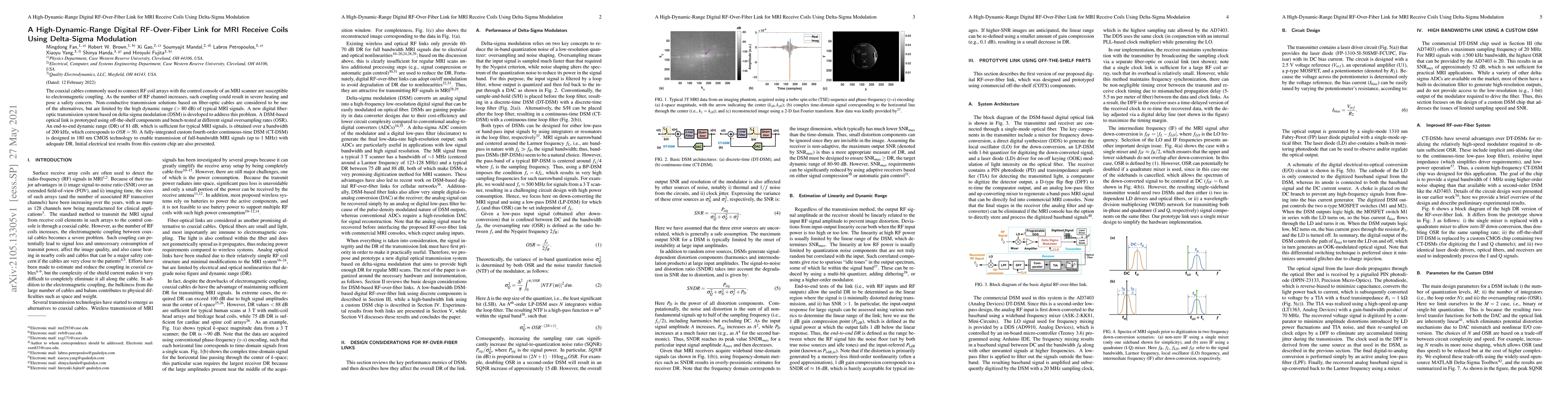The coaxial cables commonly used to connect RF coil arrays with the control console of an MRI scanner are susceptible to electromagnetic coupling. As the number of RF channel increases, such coupling could result in severe heating and pose a safety concern. Non-conductive transmission solutions based on fiber-optic cables are considered to be one of the alternatives, but are limited by the high dynamic range ($>80$~dB) of typical MRI signals. A new digital fiber-optic transmission system based on delta-sigma modulation (DSM) is developed to address this problem. A DSM-based optical link is prototyped using off-the-shelf components and bench-tested at different signal oversampling rates (OSR). An end-to-end dynamic range (DR) of 81~dB, which is sufficient for typical MRI signals, is obtained over a bandwidth of 200~kHz, which corresponds to $OSR=50$. A fully-integrated custom fourth-order continuous-time DSM (CT-DSM) is designed in 180~nm CMOS technology to enable transmission of full-bandwidth MRI signals (up to 1~MHz) with adequate DR. Initial electrical test results from this custom chip are also presented.