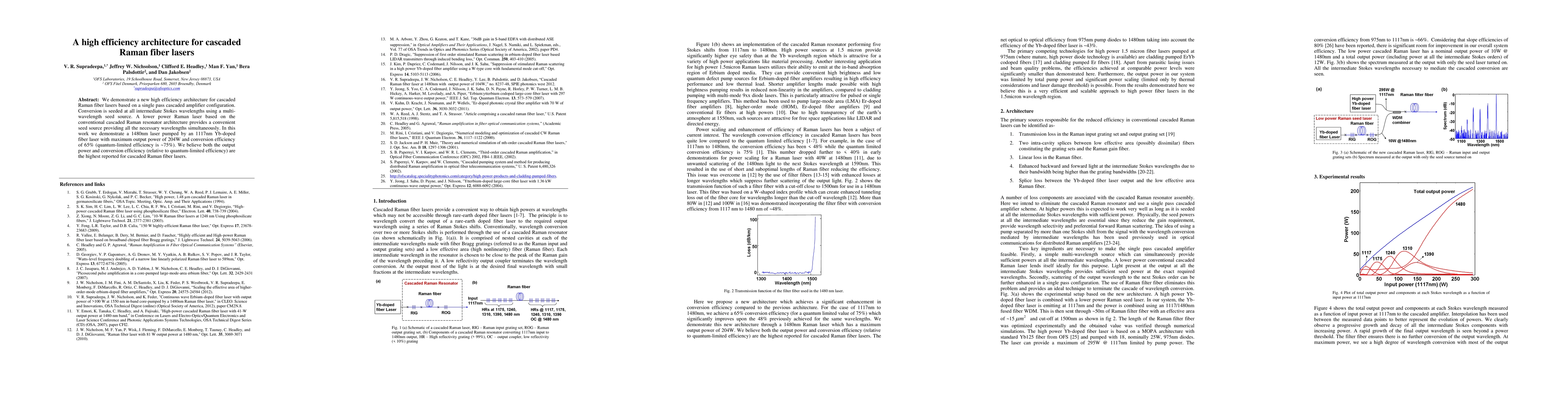 This paper presents a highly efficient single-pass architecture for cascaded Raman fiber lasers, achieving an output power of 204W and a conversion efficiency of 65%, which is believed to be the highest reported for such systems. The architecture utilizes a multi-wavelength seed source and a lower power Raman laser to seed all intermediate Stokes wavelengths.