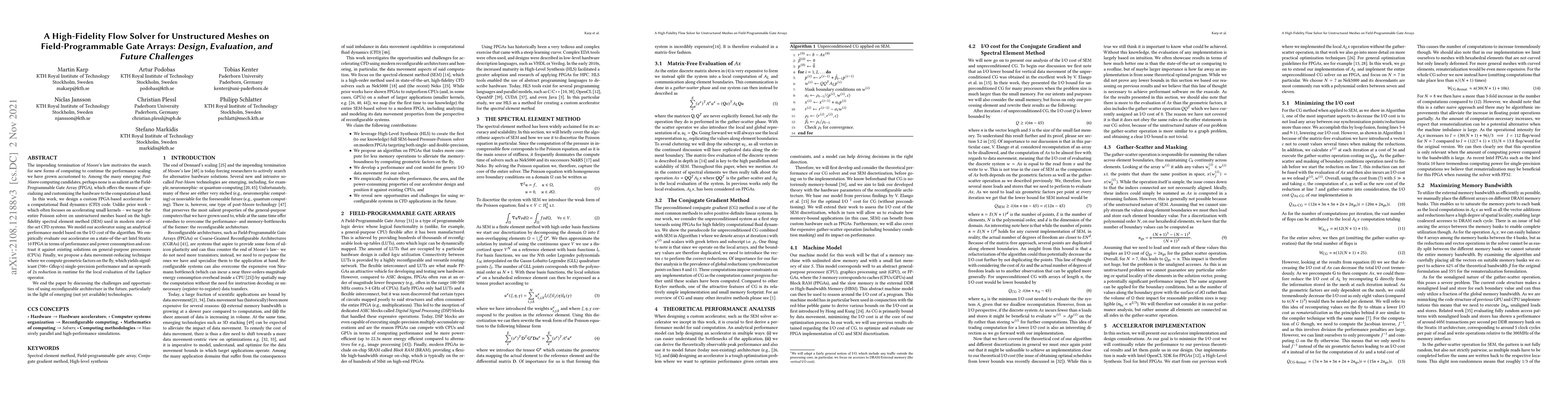 The impending termination of Moore's law motivates the search for new forms of computing to continue the performance scaling we have grown accustomed to. Among the many emerging Post-Moore computing candidates, perhaps none is as salient as the Field-Programmable Gate Array (FPGA), which offers the means of specializing and customizing the hardware to the computation at hand. In this work, we design a custom FPGA-based accelerator for a computational fluid dynamics (CFD) code. Unlike prior work -- which often focuses on accelerating small kernels -- we target the entire Poisson solver on unstructured meshes based on the high-fidelity spectral element method (SEM) used in modern state-of-the-art CFD systems. We model our accelerator using an analytical performance model based on the I/O cost of the algorithm. We empirically evaluate our accelerator on a state-of-the-art Intel Stratix 10 FPGA in terms of performance and power consumption and contrast it against existing solutions on general-purpose processors (CPUs). Finally, we propose a data movement-reducing technique where we compute geometric factors on the fly, which yields significant (700+ Gflop/s) single-precision performance and an upwards of 2x reduction in runtime for the local evaluation of the Laplace operator. We end the paper by discussing the challenges and opportunities of using reconfigurable architecture in the future, particularly in the light of emerging (not yet available) technologies.