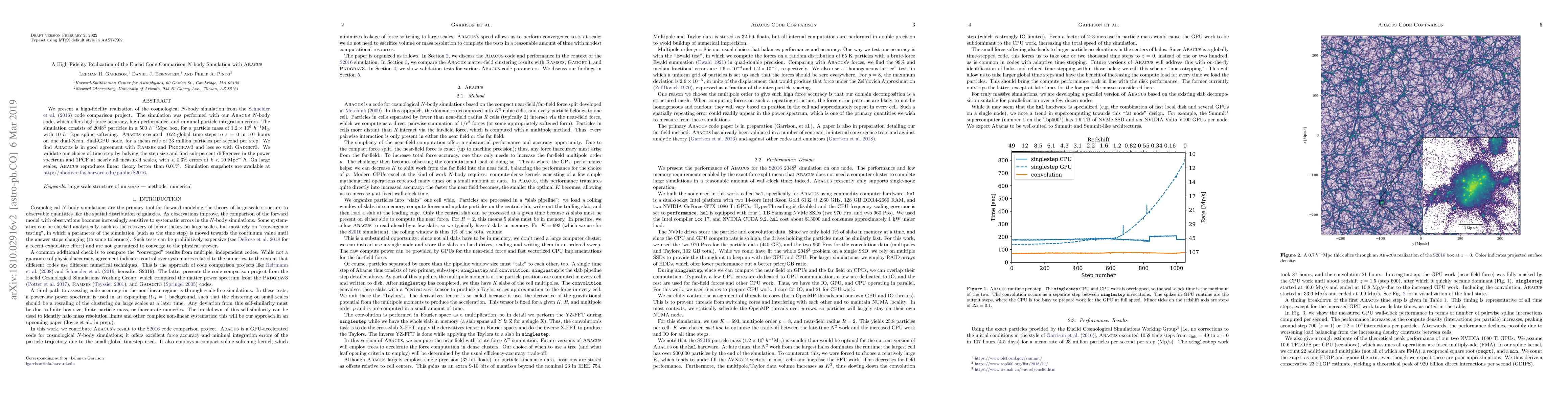 We present a high-fidelity realization of the cosmological $N$-body simulation from the Schneider et al. (2016) code comparison project. The simulation was performed with our Abacus $N$-body code, which offers high force accuracy, high performance, and minimal particle integration errors. The simulation consists of $2048^3$ particles in a $500\ h^{-1}\mathrm{Mpc}$ box, for a particle mass of $1.2\times 10^9\ h^{-1}\mathrm{M}_\odot$ with $10\ h^{-1}\mathrm{kpc}$ spline softening. Abacus executed 1052 global time steps to $z=0$ in 107 hours on one dual-Xeon, dual-GPU node, for a mean rate of 23 million particles per second per step. We find Abacus is in good agreement with Ramses and Pkdgrav3 and less so with Gadget3. We validate our choice of time step by halving the step size and find sub-percent differences in the power spectrum and 2PCF at nearly all measured scales, with $<0.3\%$ errors at $k<10\ \mathrm{Mpc}^{-1}h$. On large scales, Abacus reproduces linear theory better than $0.01\%$. Simulation snapshots are available at http://nbody.rc.fas.harvard.edu/public/S2016 .