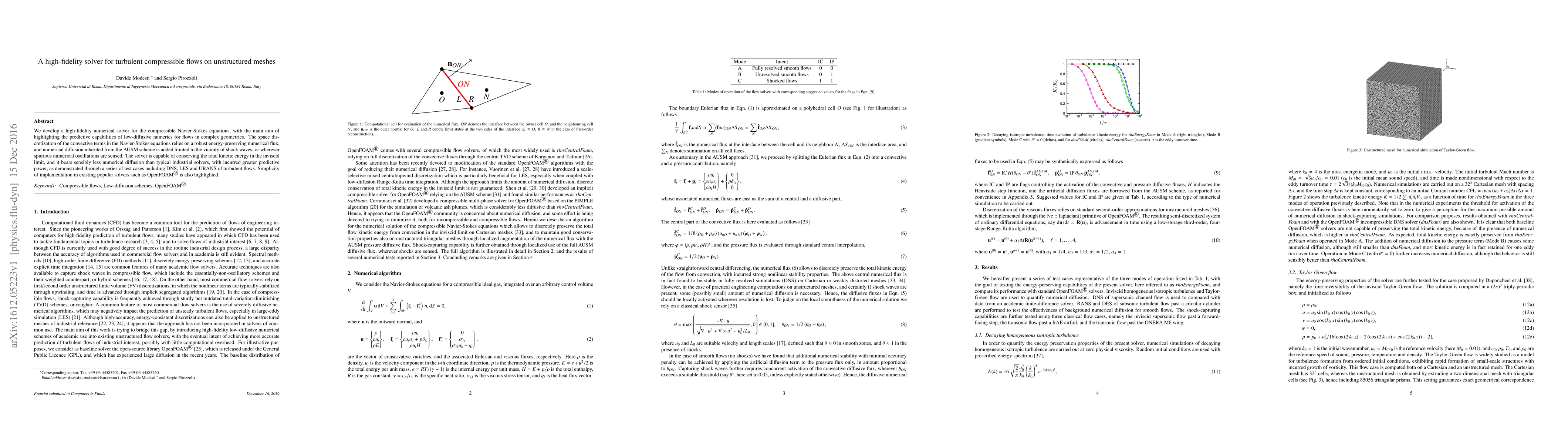 This paper presents a high-fidelity solver for turbulent compressible flows using unstructured meshes, emphasizing low-diffusive numerics for complex geometries. The solver conserves total kinetic energy and features minimal numerical diffusion, demonstrated through DNS, LES, and URANS test cases.