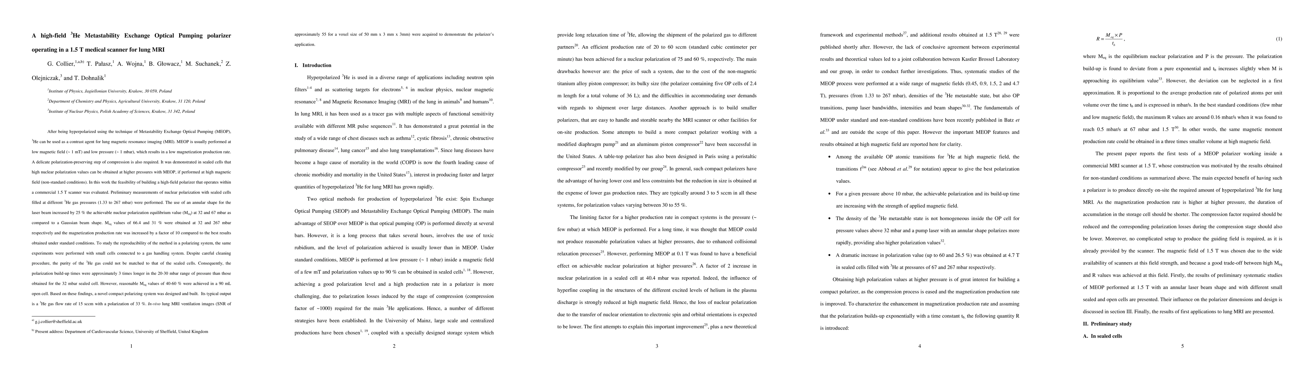After being hyperpolarized using the technique of Metastability Exchange Optical Pumping (MEOP), 3He can be used as a contrast agent for lung magnetic resonance imaging (MRI). MEOP is usually performed at low magnetic field (~ 1 mT) and low pressure (~ 1 mbar), which results in a low magnetization production rate. A delicate polarization-preserving step of compression is also required. It was demonstrated in sealed cells that high nuclear polarization values can be obtained at higher pressures with MEOP, if performed at high magnetic field (non-standard conditions). In this work the feasibility of building a high-field polarizer that operates within a commercial 1.5 T scanner was evaluated. Preliminary measurements of nuclear polarization with sealed cells filled at different 3He gas pressures (1.33 to 267 mbar) were performed. The use of an annular shape for the laser beam increased by 25 % the achievable nuclear polarization equilibrium value (Meq) at 32 and 67 mbar as compared to a Gaussian beam shape. Meq values of 66.4 and 31 % were obtained at 32 and 267 mbar respectively and the magnetization production rate was increased by a factor of 10 compared to the best results obtained under standard conditions. To study the reproducibility of the method in a polarizing system, the same experiments were performed with small cells connected to a gas handling system. The polarization build-up times were approximately 3 times longer in the 20-30 mbar range of pressure than those obtained for the 32 mbar sealed cell. However, reasonable Meq values of 40-60 % were achieved in a 90 mL open cell. Based on these findings, a novel compact polarizing system was designed and built. Its typical output is a 3He gas flow rate of 15 sccm with a polarization of 33 %. In-vivo lung MRI ventilation images were acquired to demonstrate the polarizer s application.