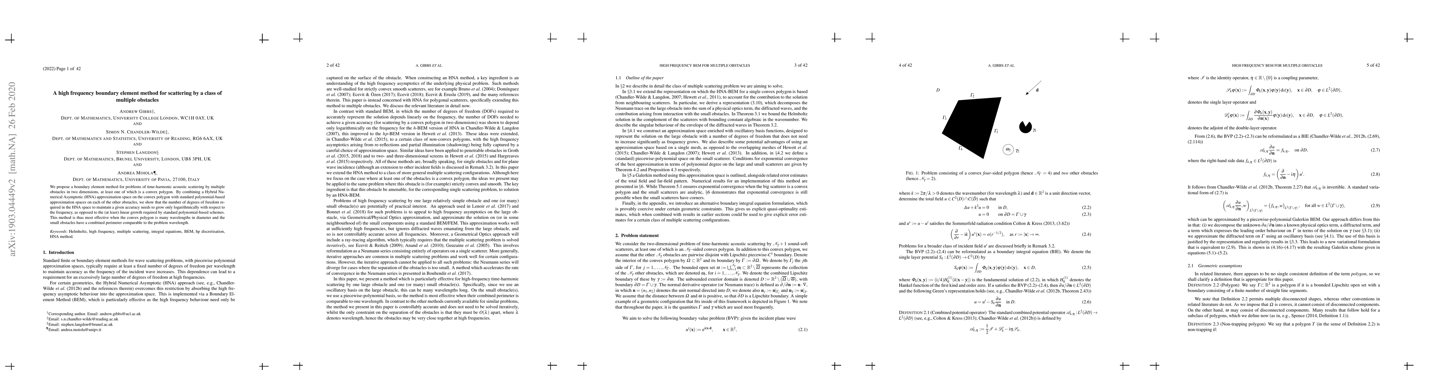 This paper introduces a high-frequency boundary element method for scattering problems involving multiple obstacles, particularly focusing on a convex polygon. It combines a Hybrid Numerical Asymptotic approximation for the convex polygon with polynomial-based methods for others, demonstrating logarithmic growth in degrees of freedom with frequency, significantly improving efficiency for high-frequency scenarios.