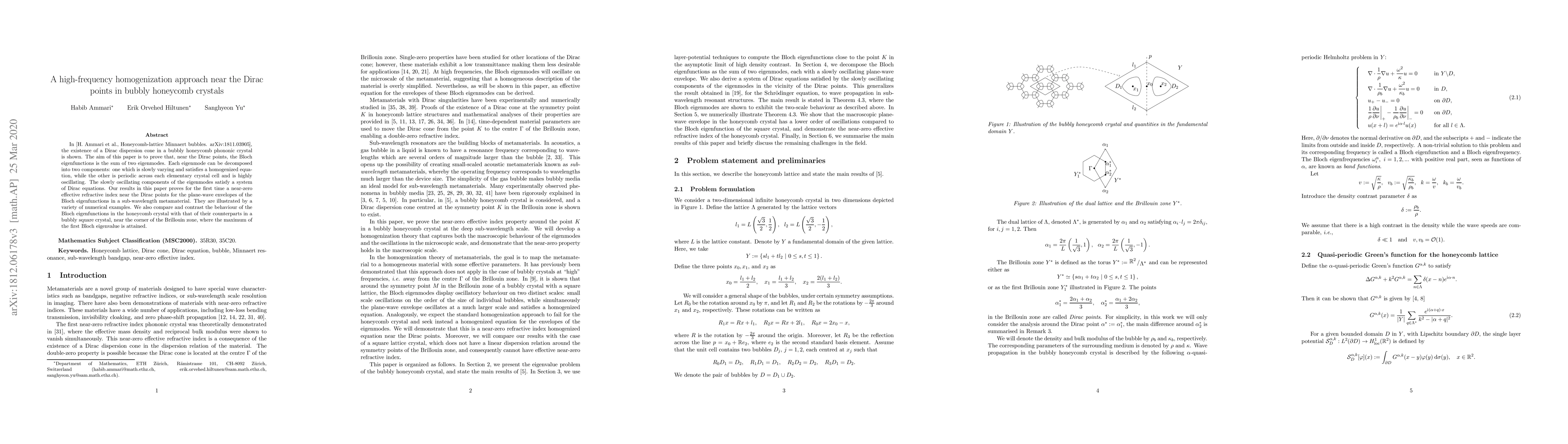 In [H. Ammari et al., Honeycomb-lattice Minnaert bubbles. arXiv:1811.03905], the existence of a Dirac dispersion cone in a bubbly honeycomb phononic crystal is shown. The aim of this paper is to prove that, near the Dirac points, the Bloch eigenfunctions is the sum of two eigenmodes. Each eigenmode can be decomposed into two components: one which is slowly varying and satisfies a homogenized equation, while the other is periodic across each elementary crystal cell and is highly oscillating. The slowly oscillating components of the eigenmodes satisfy a system of Dirac equations. Our results in this paper proves for the first time a near-zero effective refractive index near the Dirac points for the plane-wave envelopes of the Bloch eigenfunctions in a sub-wavelength metamaterial. They are illustrated by a variety of numerical examples. We also compare and contrast the behaviour of the Bloch eigenfunctions in the honeycomb crystal with that of their counterparts in a bubbly square crystal, near the corner of the Brillouin zone, where the maximum of the first Bloch eigenvalue is attained.