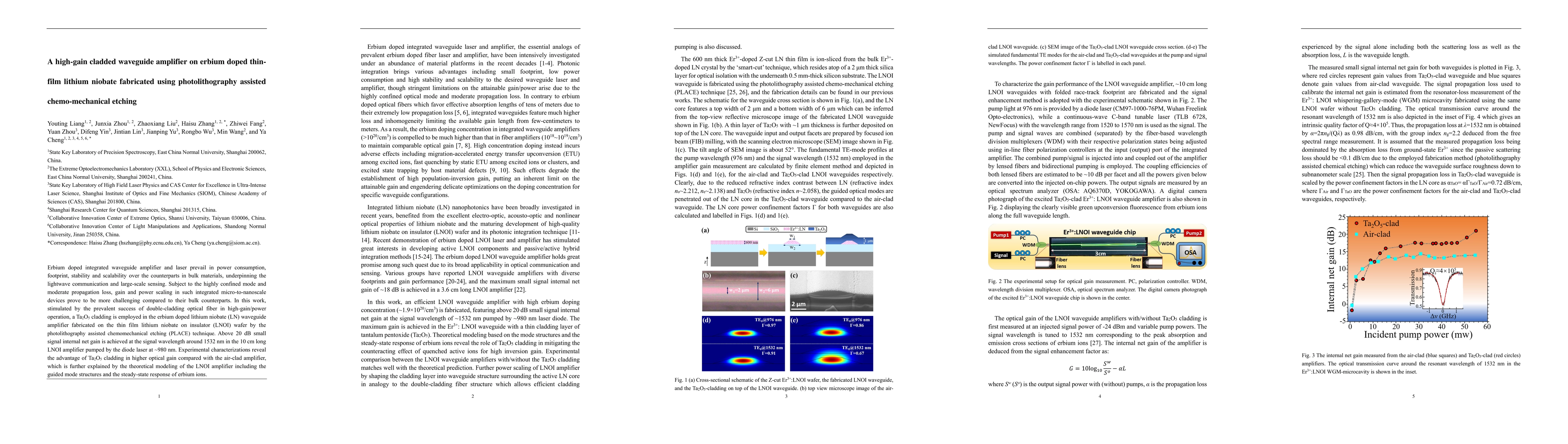 This research develops a high-gain, erbium-doped thin-film lithium niobate waveguide amplifier on an LNOI substrate using PLACE, achieving over 20 dB net gain at 1532 nm, leveraging Ta2O5 cladding for enhanced optical gain compared to air-clad designs.