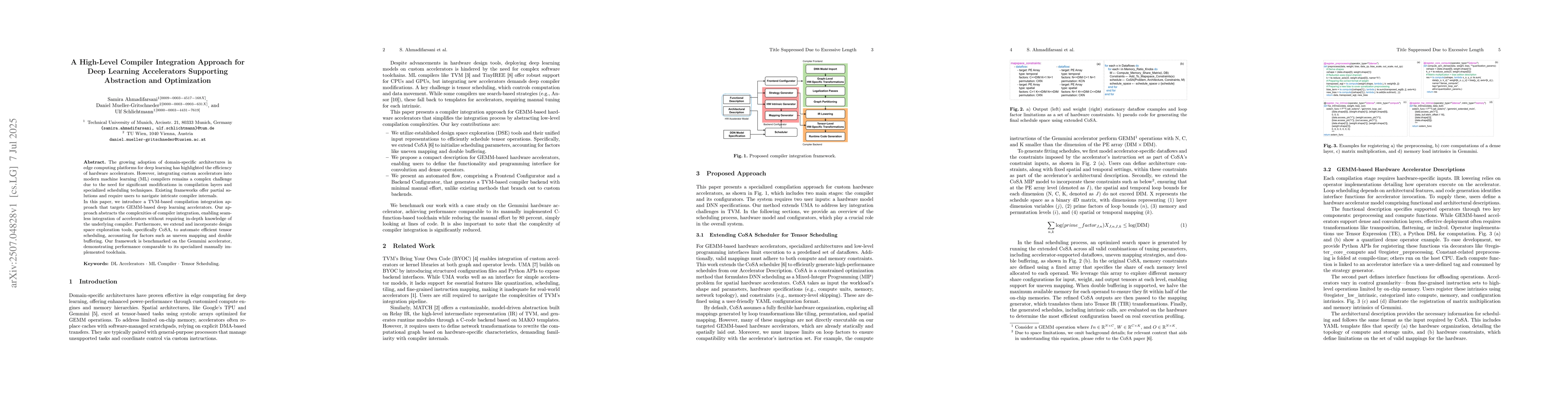 The growing adoption of domain-specific architectures in edge computing platforms for deep learning has highlighted the efficiency of hardware accelerators. However, integrating custom accelerators into modern machine learning (ML) compilers remains a complex challenge due to the need for significant modifications in compilation layers and specialized scheduling techniques. Existing frameworks offer partial solutions and require users to navigate intricate compiler internals. In this paper, we introduce a TVM-based compilation integration approach that targets GEMM-based deep learning accelerators. Our approach abstracts the complexities of compiler integration, enabling seamless integration of accelerators without requiring in-depth knowledge of the underlying compiler. Furthermore, we extend and incorporate design space exploration tools, specifically CoSA, to automate efficient tensor scheduling, accounting for factors such as uneven mapping and double buffering. Our framework is benchmarked on the Gemmini accelerator, demonstrating performance comparable to its specialized manually implemented toolchain.