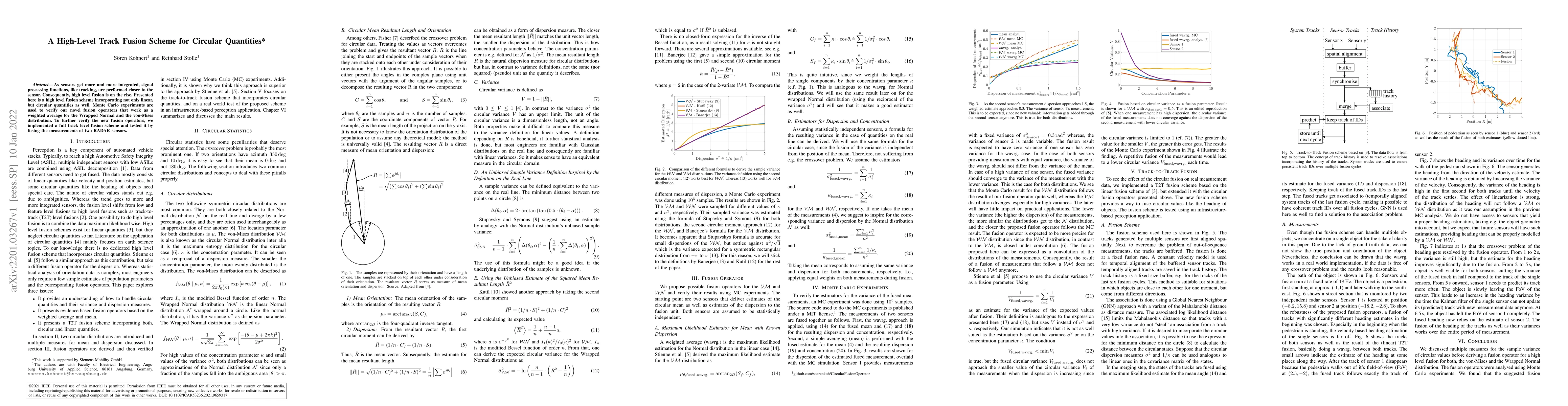As sensors get more and more integrated, signal processing functions, like tracking, are performed closer to the sensor. Consequently, high level fusion is on the rise. Presented here is a high level fusion scheme incorporating not only linear,but circular quantities as well. Monte Carlo experiments are used to verify our novel fusion operators that work as a weighted average for the Wrapped Normal and the von-Mises distribution. To further verify the new fusion operators, we implemented a full track level fusion scheme and tested it by fusing the measurements of two RADAR sensors.
