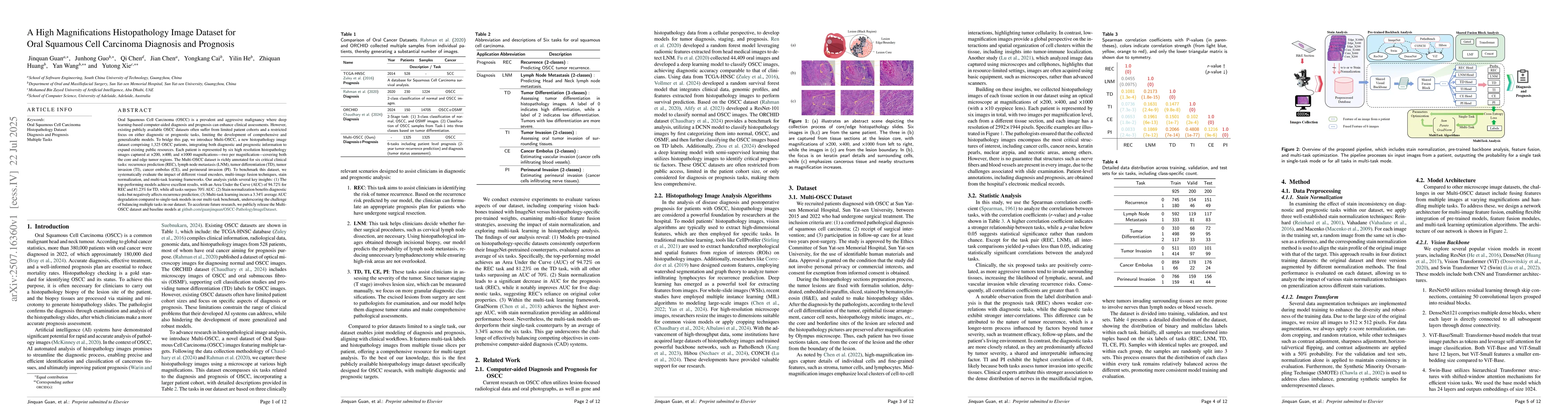 The research introduces Multi-OSCC, a histopathology image dataset with 1,325 Oral Squamous Cell Carcinoma (OSCC) patients, offering high-resolution images for diagnostic and prognostic tasks. Benchmarking reveals top models achieve high AUC scores, with stain normalization benefiting diagnostics but harming recurrence prediction, and multi-task learning showing slight performance drops.