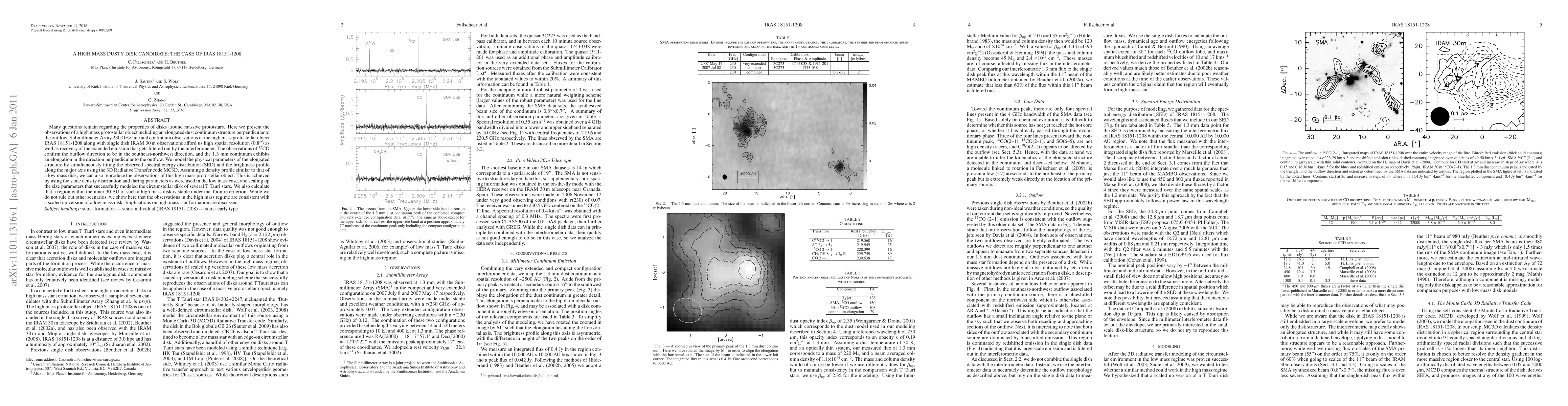 Many questions remain regarding the properties of disks around massive prototstars. Here we present the observations of a high mass protostellar object including an elongated dust continuum structure perpendicular to the outflow. Submillimeter Array 230 GHz line and continuum observations of the high mass protostellar object IRAS 18151-1208 along with single dish IRAM 30m observations afford us high spatial resolution (0.8") as well as recovery of the extended emission that gets filtered out by the interferometer. The observations of 12CO confirm the outflow direction to be in the southeast-northwest direction, and the 1.3 mm continuum exhibits an elongation in the direction perpendicular to the outflow. We model the physical parameters of the elongated structure by simultaneously fitting the observed spectral energy distribution (SED) and the brightness profile along the major axis using the 3D Radiative Transfer code MC3D. Assuming a density profile similar to that of a low mass disk, we can also reproduce the observations of this high mass protostellar object. This is achieved by using the same density distribution and flaring parameters as were used in the low mass case, and scaling up the size parameters that successfully modeled the circumstellar disk of several T Tauri stars. We also calculate that a region within the inner 30 AU of such a high mass disk is stable under the Toomre criterion. While we do not rule out other scenarios, we show here that the observations in the high mass regime are consistent with a scaled up version of a low mass disk. Implications on high mass star formation are discussed.