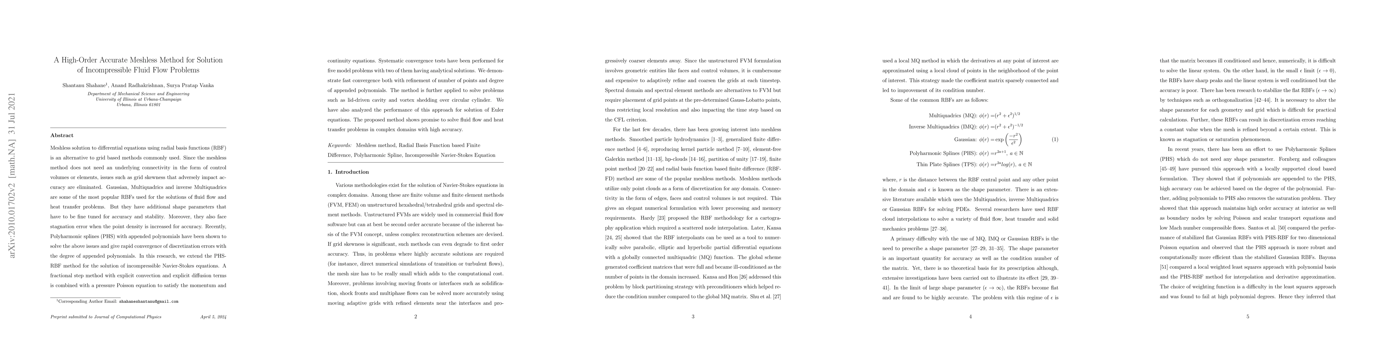 This paper presents a high-order accurate meshless method using Polyharmonic splines with appended polynomials to solve incompressible fluid flow problems. The method demonstrates rapid convergence and high accuracy, effectively addressing issues like grid skewness and stagnation error, and shows promise for complex fluid dynamics simulations.