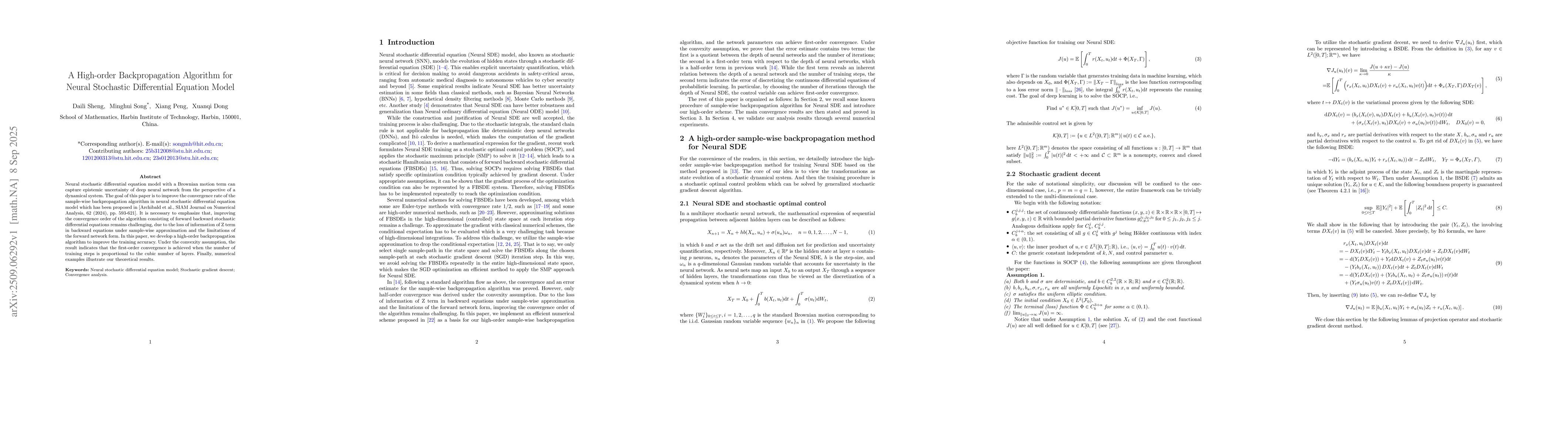 Neural stochastic differential equation model with a Brownian motion term can capture epistemic uncertainty of deep neural network from the perspective of a dynamical system. The goal of this paper is to improve the convergence rate of the sample-wise backpropagation algorithm in neural stochastic differential equation model which has been proposed in [Archibald et al., SIAM Journal on Numerical Analysis, 62 (2024), pp. 593-621]. It is necessary to emphasize that, improving the convergence order of the algorithm consisting of forward backward stochastic differential equations remains challenging, due to the loss of information of Z term in backward equations under sample-wise approximation and the limitations of the forward network form. In this paper, we develop a high-order backpropagation algorithm to improve the training accuracy. Under the convexity assumption, the result indicates that the first-order convergence is achieved when the number of training steps is proportional to the cubic number of layers. Finally, numerical examples illustrate our theoretical results.