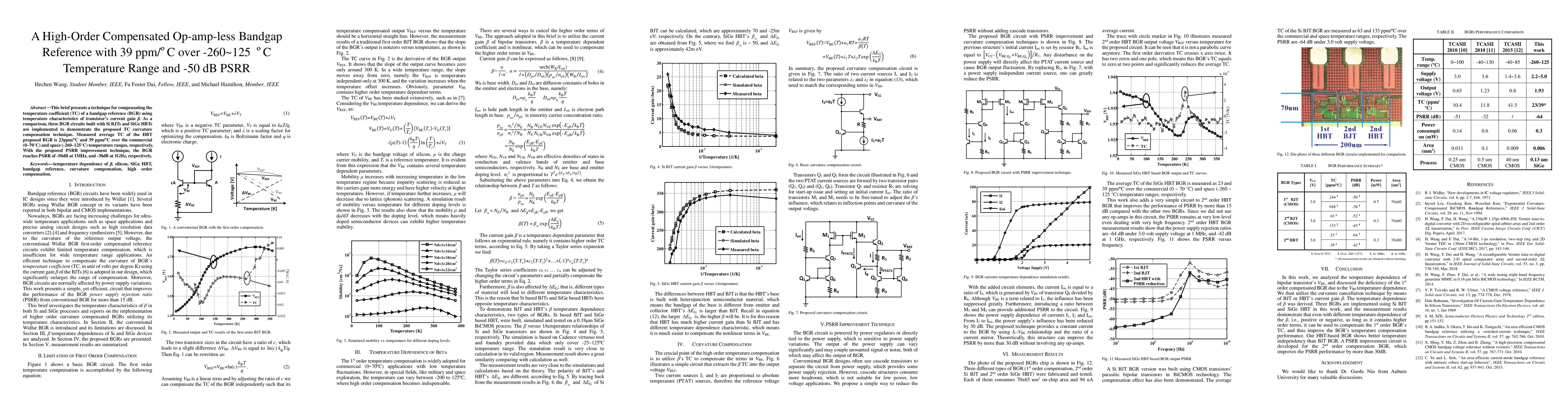 This paper introduces a high-order compensated op-amp-less bandgap reference with a remarkable temperature coefficient of 39 ppm/°C over a wide -260 to 125 °C range and a power supply rejection ratio (PSRR) of -50 dB at 1 MHz. The technique uses transistor current gain eta's temperature characteristics for curvature compensation, demonstrated through Si BJTs and SiGe HBTs implementation.