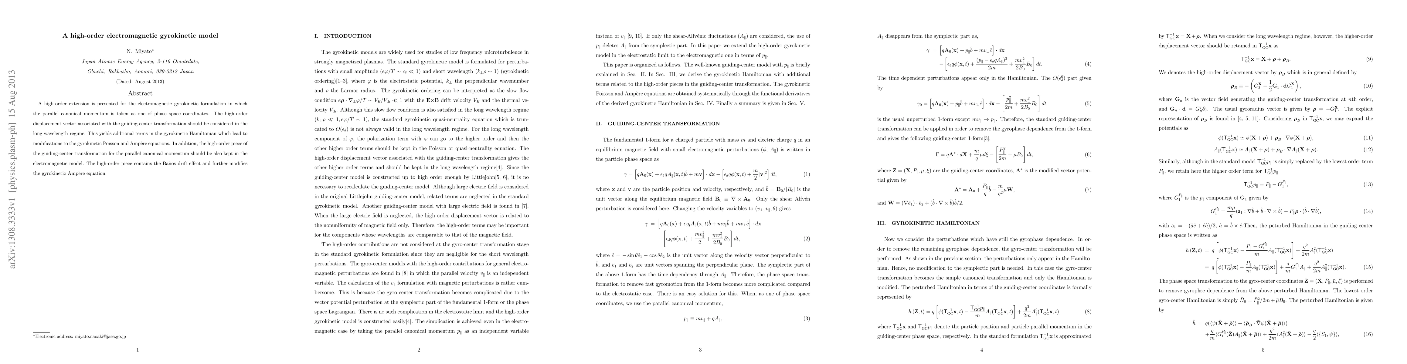 This paper introduces a high-order electromagnetic gyrokinetic model that incorporates the parallel canonical momentum as a phase space coordinate, leading to modifications in the gyrokinetic Hamiltonian and Poisson and Ampere equations, including the Bányász drift effect. The high-order displacement vector and transformation are essential for the long wavelength regime.