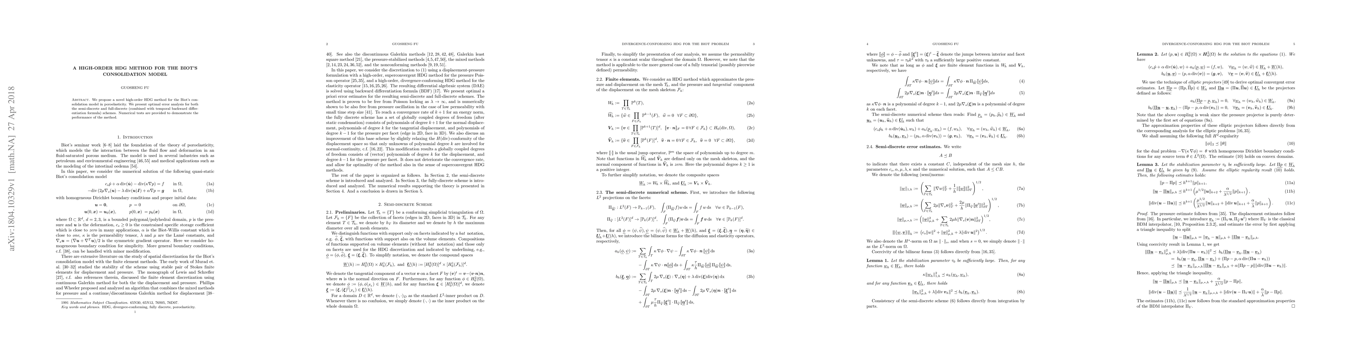 The paper proposes a novel high-order Hybrid High-Order (HHO) method for Biot's consolidation model in poroelasticity, combined with a Backward Differentiation Formula (BDF) for temporal discretization.