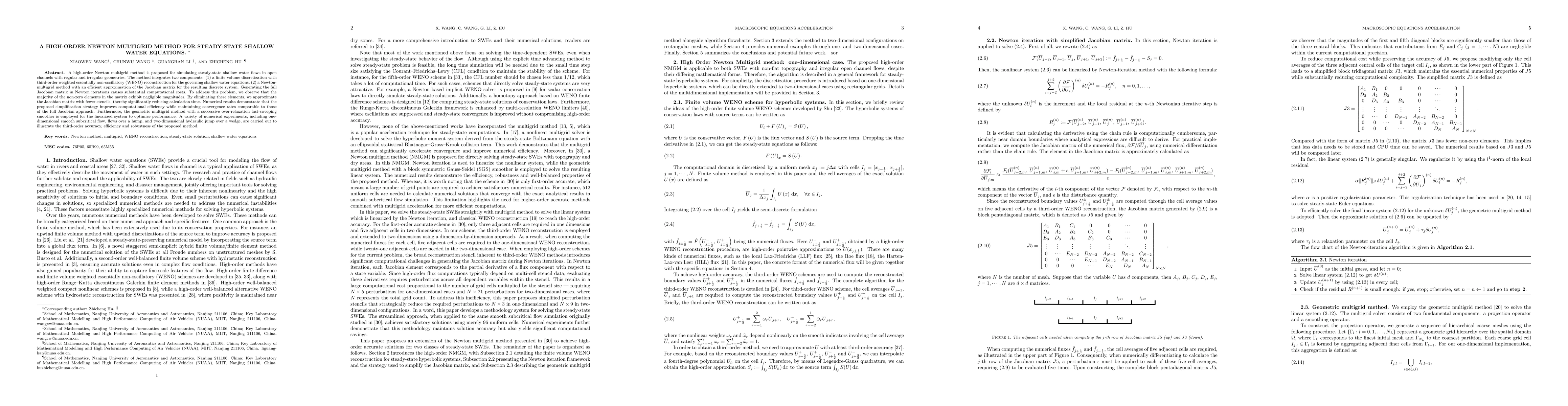 The research proposes a high-order Newton multigrid method integrating finite volume discretization with third-order WENO reconstruction for shallow water equations, and approximating the Jacobian matrix with fewer stencils to reduce computational costs.