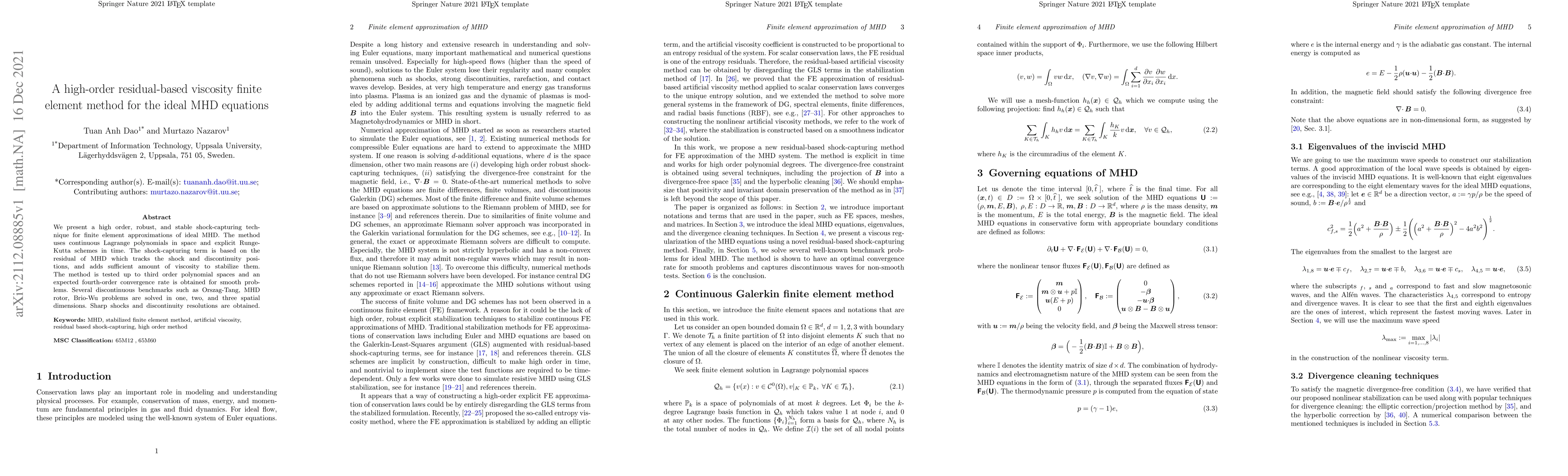 This paper introduces a high-order finite element method for solving ideal MHD equations using continuous Lagrange polynomials and explicit Runge-Kutta schemes. The method incorporates a shock-capturing term based on MHD residuals to stabilize shocks and discontinuities, achieving up to fourth-order convergence for smooth problems.