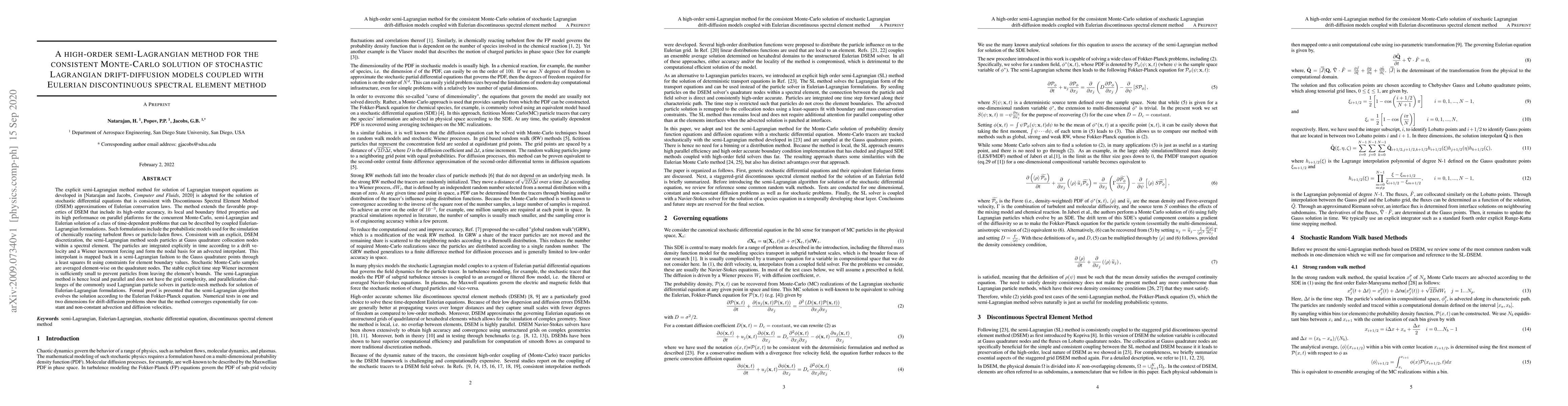 This paper proposes a high-order semi-Lagrangian method for solving stochastic Lagrangian drift-diffusion models, integrating it with the Discontinuous Spectral Element Method (DSEM) for Eulerian conservation laws. The method demonstrates high-order accuracy and parallel efficiency, showing exponential convergence in numerical tests.