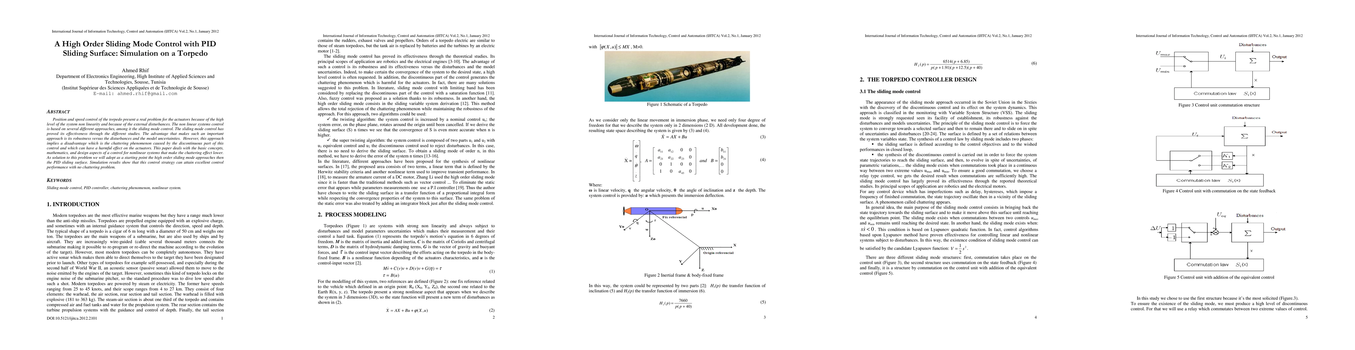 Position and speed control of the torpedo present a real problem for the actuators because of the high level of the system non linearity and because of the external disturbances. The non linear systems control is based on several different approaches, among it the sliding mode control. The sliding mode control has proved its effectiveness through the different studies. The advantage that makes such an important approach is its robustness versus the disturbances and the model uncertainties. However, this approach implies a disadvantage which is the chattering phenomenon caused by the discontinuous part of this control and which can have a harmful effect on the actuators. This paper deals with the basic concepts, mathematics, and design aspects of a control for nonlinear systems that make the chattering effect lower. As solution to this problem we will adopt as a starting point the high order sliding mode approaches then the PID sliding surface. Simulation results show that this control strategy can attain excellent control performance with no chattering problem.