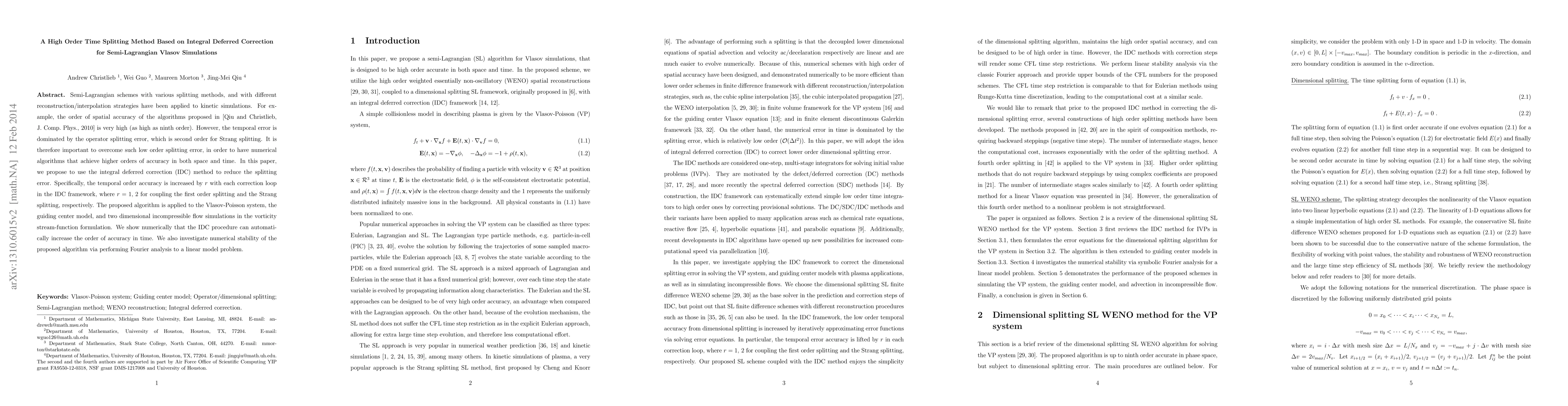 This paper proposes a high-order time splitting method based on integral deferred correction (IDC) to enhance temporal accuracy in semi-Lagrangian Vlasov simulations. The method effectively reduces splitting errors, achieving higher temporal accuracy through iterative correction loops.