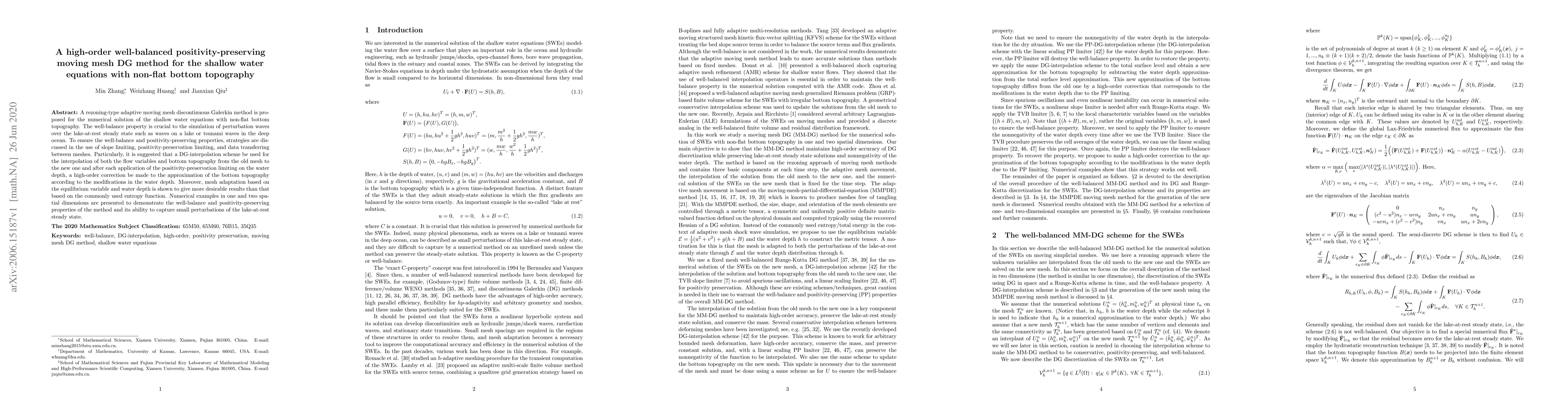 This paper proposes a high-order, well-balanced, positivity-preserving moving mesh DG method for solving shallow water equations over non-flat bottoms. It employs adaptive mesh rezoning and strategies like slope limiting, ensuring accurate simulation of perturbations like lake waves and tsunamis.