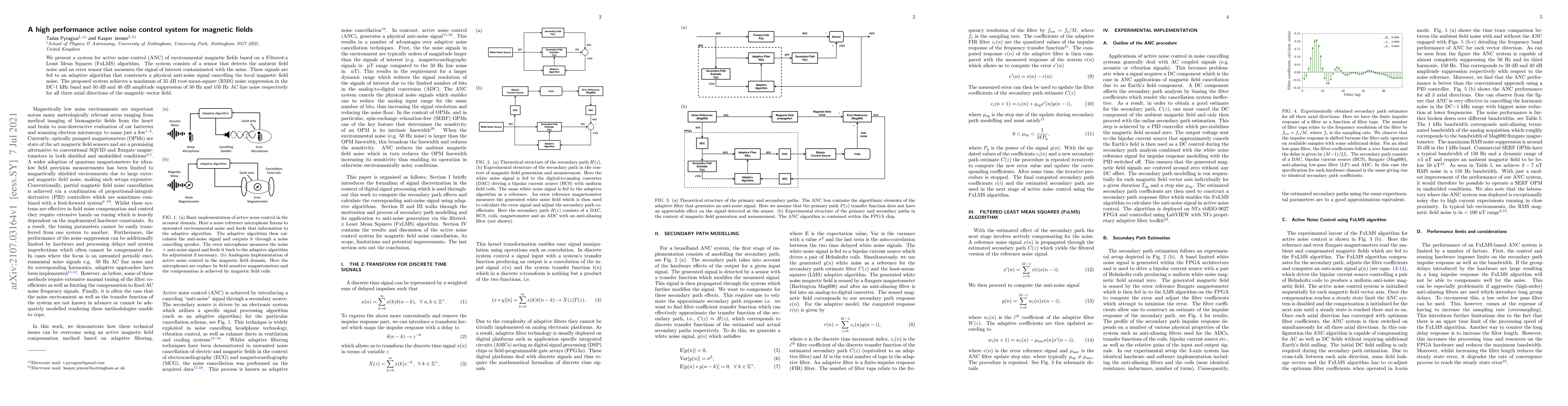 We present a system for active noise control (ANC) of environmental magnetic fields based on a Filtered-x Least Mean Squares (FxLMS) algorithm. The system consists of a sensor that detects the ambient field noise and an error sensor that measures the signal of interest contaminated with the noise. These signals are fed to an adaptive algorithm that constructs a physical anti-noise signal cancelling the local magnetic field noise. The proposed system achieves a maximum of 35 dB root-mean-square (RMS) noise suppression in the DC-1 kHz band and 50 dB and 40 dB amplitude suppression of 50 Hz and 150 Hz AC line noise respectively for all three axial directions of the magnetic vector field.