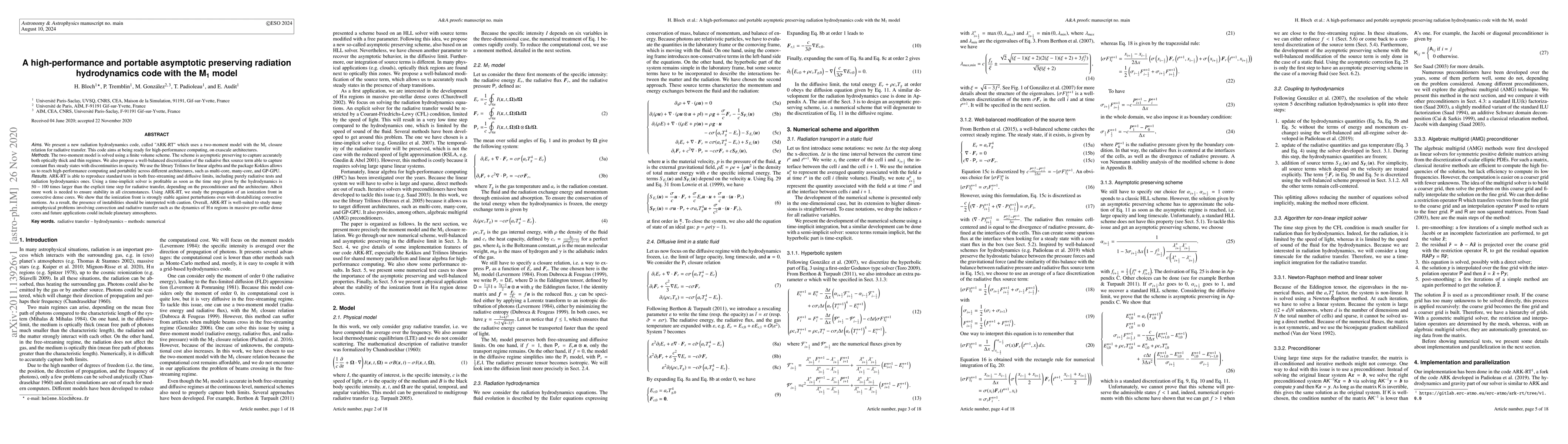 Aims. We present a new radiation hydrodynamics code, called "ARK-RT" which uses a two-moment model with the M1 closure relation for radiative transfer. This code aims at being ready for high-performance computing, on exascale architectures. Methods. The two-moment model is solved using a finite volume scheme. The scheme is asymptotic preserving to capture accurately both optically thick and thin regimes. We also propose a well-balanced discretization of the radiative flux source term able to capture constant flux steady states with discontinuities in opacity. We use the library Trilinos for linear algebra and the package Kokkos allows us to reach high-performance computing and portability across different architectures, such as multi-core, many-core, and GP-GPU. Results. ARK-RT is able to reproduce standard tests in both free-streaming and diffusive limits, including purely radiative tests and radiation hydrodynamics ones. Using a time-implicit solver is profitable as soon as the time step given by the hydrodynamics is 50-100 times larger than the explicit time step for radiative transfer, depending on the preconditioner and the architecture. Albeit more work is needed to ensure stability in all circumstances. Using ARK-RT, we study the propagation of an ionization front in convective dense cores. We show that the ionization front is strongly stable against perturbations even with destabilizing convective motions. As a result, the presence of instabilities should be interpreted with caution. Overall, ARK-RT is well-suited to study many astrophysical problems involving convection and radiative transfer such as the dynamics of H ii regions in massive pre-stellar dense cores and future applications could include planetary atmospheres.