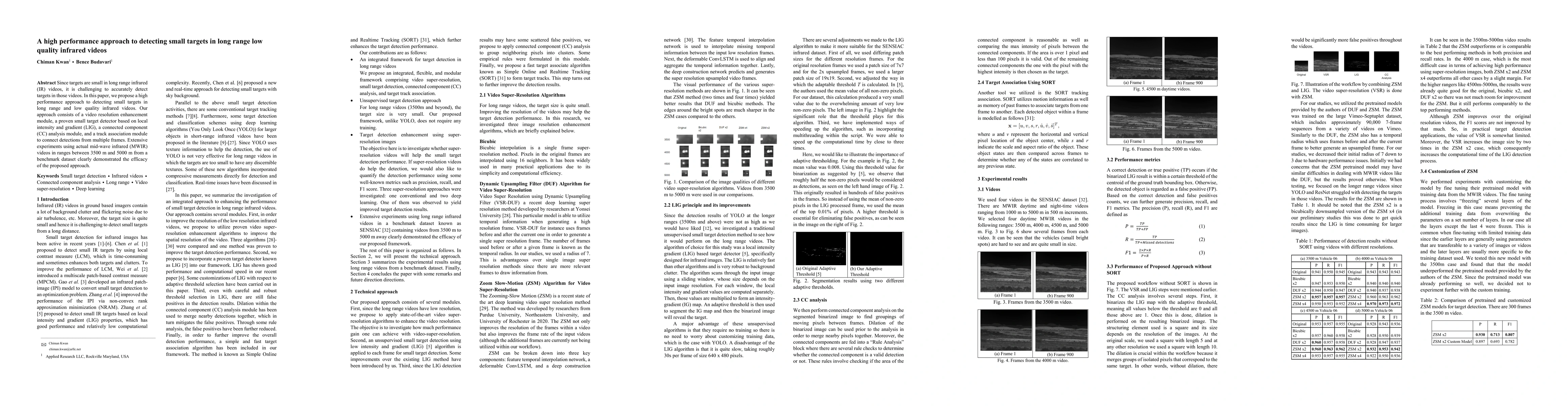 This paper proposes a high-performance method for detecting small targets in long-range, low-quality infrared videos, utilizing a resolution enhancement module, a local intensity and gradient-based detector, connected component analysis, and a track association module. Experiments on mid-wave infrared videos show the approach's effectiveness.