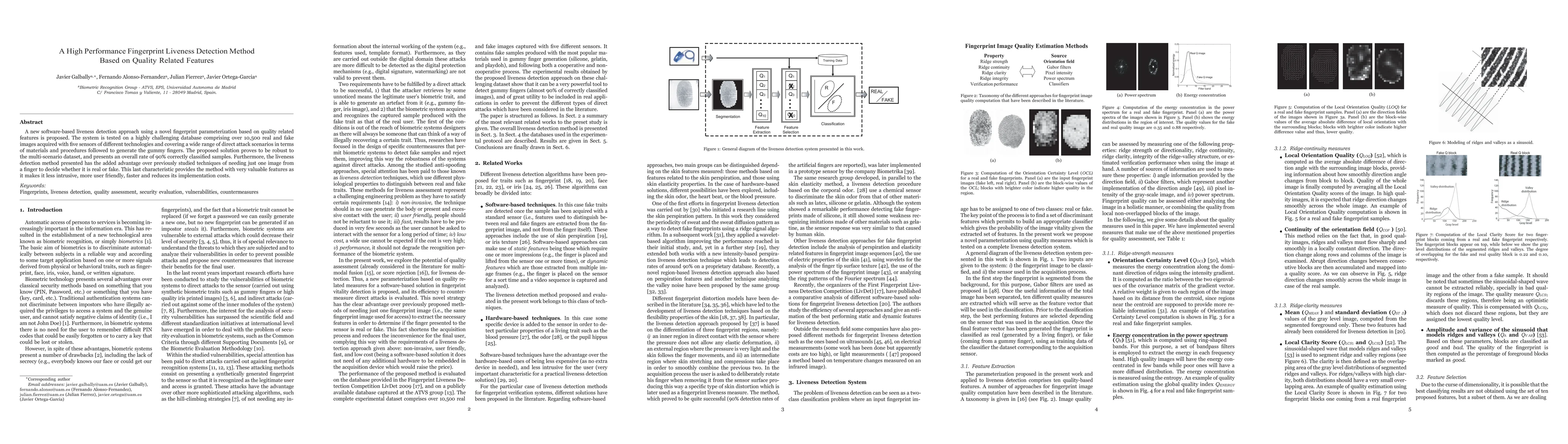 A new software-based liveness detection approach using a novel fingerprint parameterization based on quality related features is proposed. The system is tested on a highly challenging database comprising over 10,500 real and fake images acquired with five sensors of different technologies and covering a wide range of direct attack scenarios in terms of materials and procedures followed to generate the gummy fingers. The proposed solution proves to be robust to the multi-scenario dataset, and presents an overall rate of 90% correctly classified samples. Furthermore, the liveness detection method presented has the added advantage over previously studied techniques of needing just one image from a finger to decide whether it is real or fake. This last characteristic provides the method with very valuable features as it makes it less intrusive, more user friendly, faster and reduces its implementation costs.