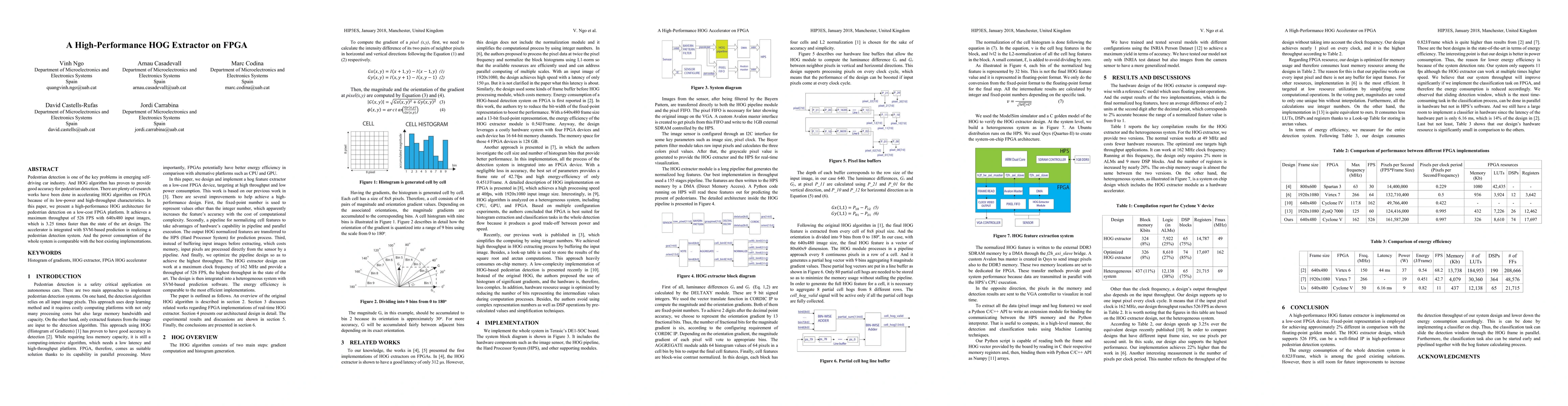 This paper presents a high-performance HOG extractor on an FPGA for pedestrian detection in self-driving cars, achieving 526 FPS with 640x480 images, 3.25 times faster than existing designs, while maintaining comparable power consumption. The system integrates an SVM-based predictor for efficient detection.