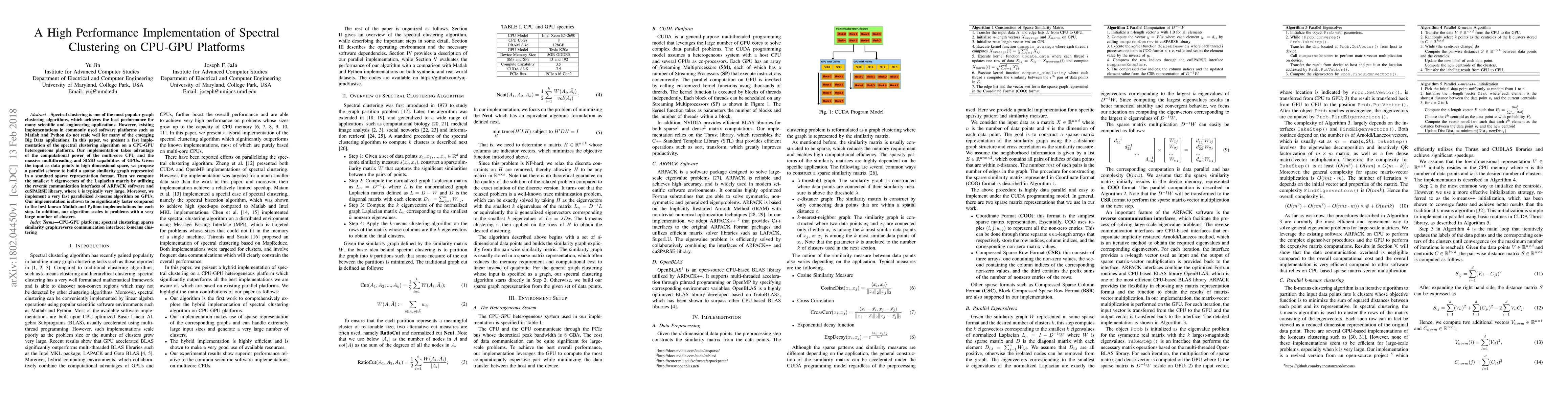 The paper presents a high-performance implementation of spectral clustering on CPU-GPU platforms, leveraging multi-core CPUs and GPU's massive multithreading and SIMD capabilities. It constructs a sparse similarity graph in a standard sparse representation format and computes the smallest k eigenvectors of the Laplacian matrix using reverse communication interfaces of ARPACK software and cuSPARSE library. A parallelized k-means algorithm on GPUs is also implemented.