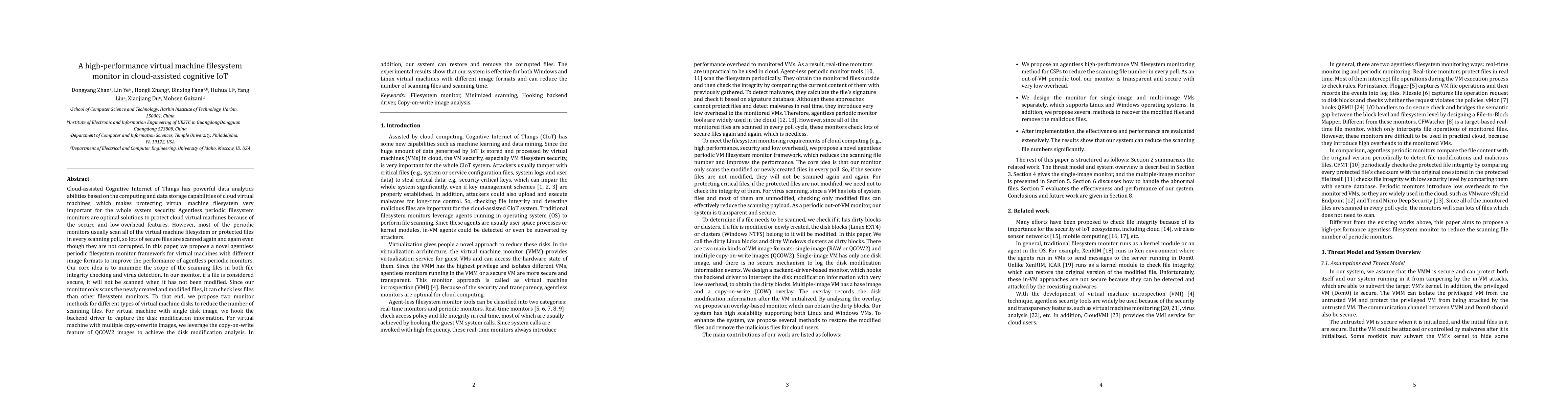 Cloud-assisted Cognitive Internet of Things has powerful data analytics abilities based on the computing and data storage capabilities of cloud virtual machines, which makes protecting virtual machine filesystem very important for the whole system security. Agentless periodic filesystem monitors are optimal solutions to protect cloud virtual machines because of the secure and low-overhead features. However, most of the periodic monitors usually scan all of the virtual machine filesystem or protected files in every scanning poll, so lots of secure files are scanned again and again even though they are not corrupted. In this paper, we propose a novel agentless periodic filesystem monitor framework for virtual machines with different image formats to improve the performance of agentless periodic monitors. Our core idea is to minimize the scope of the scanning files in both file integrity checking and virus detection. In our monitor, if a file is considered secure, it will not be scanned when it has not been modified. Since our monitor only scans the newly created and modified files, it can check fewer files than other filesystem monitors. To that end, we propose two monitor methods for different types of virtual machine disks to reduce the number of scanning files. For virtual machine with single disk image, we hook the backend driver to capture the disk modification information. For virtual machine with multiple copy-onwrite images, we leverage the copy-on-write feature of QCOW2 images to achieve the disk modification analysis. In addition, our system can restore and remove the corrupted files. The experimental results show that our system is effective for both Windows and Linux virtual machines with different image formats and can reduce the number of scanning files and scanning time.