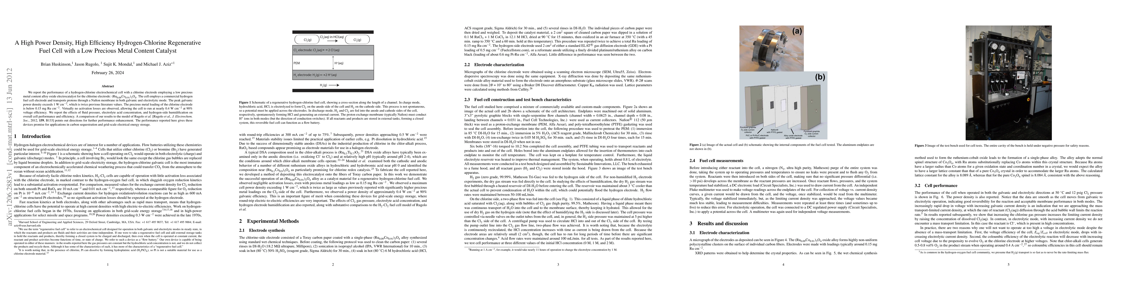 This paper presents a high power density, high efficiency hydrogen-chlorine regenerative fuel cell with a low precious metal content catalyst, achieving peak power density of over 1 W cm^-2 and nearly 0.4 W cm^-2 at 90% voltage efficiency. The study highlights the potential of this technology for carbon sequestration and grid-scale energy storage.