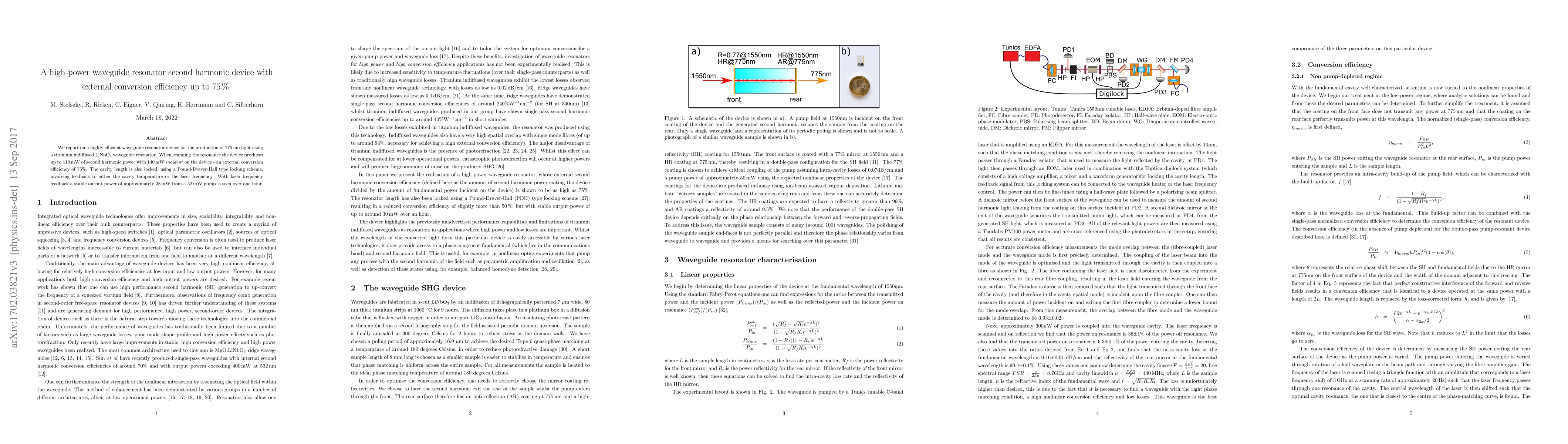 This paper describes a highly efficient waveguide resonator device for generating 775 nm light, achieving an external conversion efficiency of 75% by producing up to 110 mW of second harmonic power from a 140 mW input. The device employs a titanium indiffused LiNbO3 waveguide and uses a Pound-Drever-Hall locking scheme for stable output power.