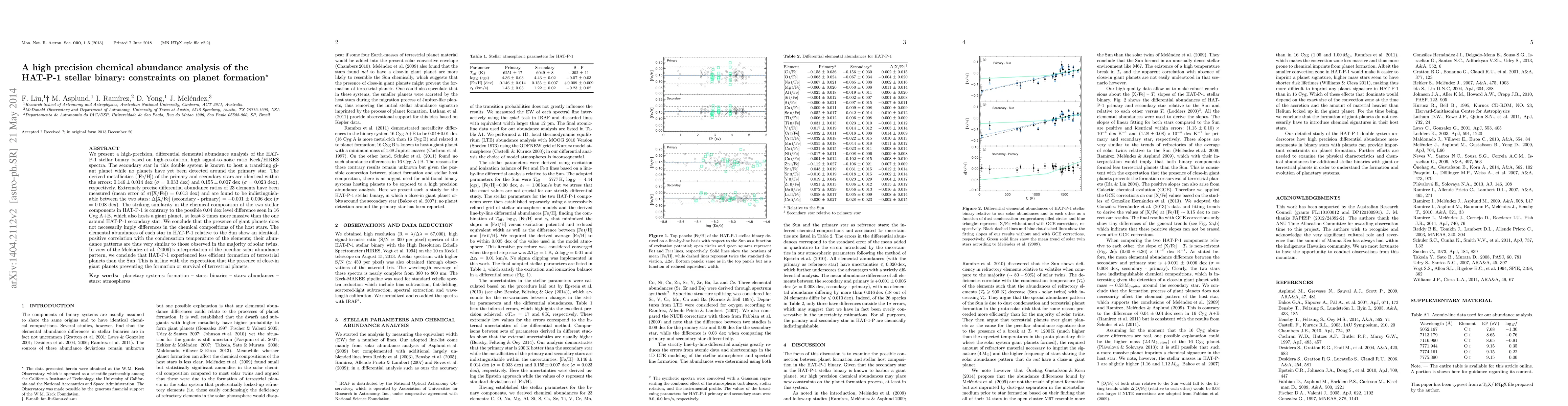 This study presents high-precision chemical abundance analysis of the HAT-P-1 stellar binary, revealing identical metallicities and elemental abundance patterns between the two stars, suggesting that giant planets do not necessarily cause differences in stellar chemical compositions. The findings imply less efficient terrestrial planet formation in HAT-P-1 compared to the Sun.