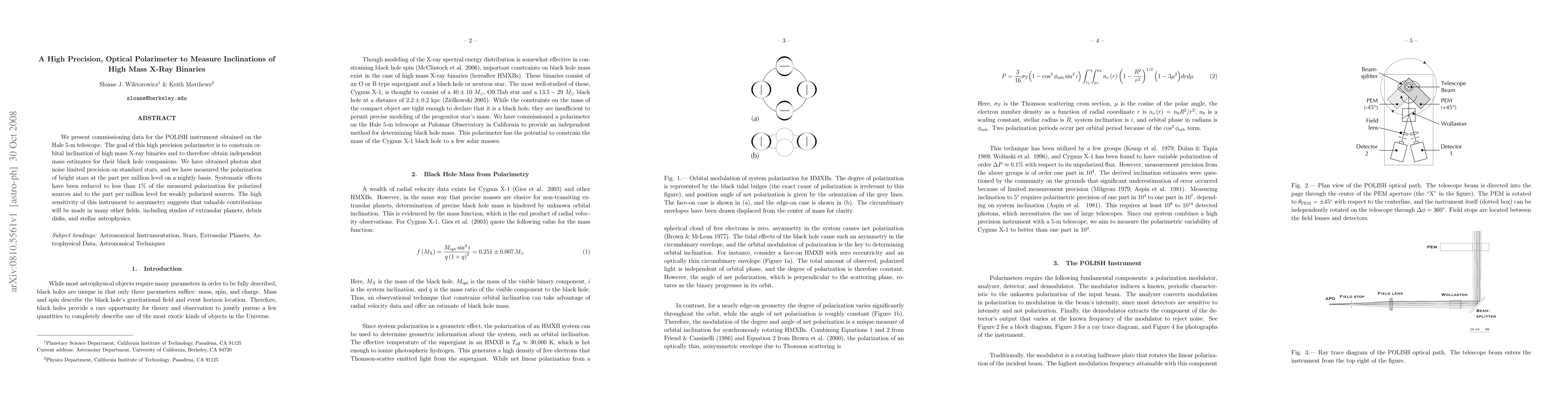 We present commissioning data for the POLISH instrument obtained on the Hale 5-m telescope. The goal of this high precision polarimeter is to constrain orbital inclination of high mass X-ray binaries and to therefore obtain independent mass estimates for their black hole companions. We have obtained photon shot noise limited precision on standard stars, and we have measured the polarization of bright stars at the part per million level on a nightly basis. Systematic effects have been reduced to less than 1% of the measured polarization for polarized sources and to the part per million level for weakly polarized sources. The high sensitivity of this instrument to asymmetry suggests that valuable contributions will be made in many other fields, including studies of extrasolar planets, debris disks, and stellar astrophysics.
