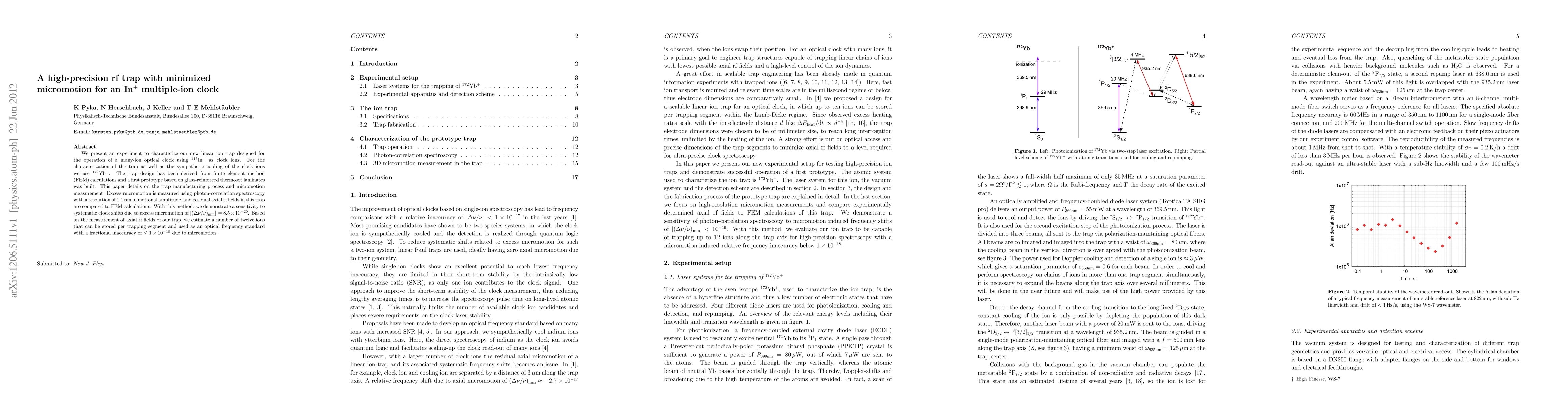 We present an experiment to characterize our new linear ion trap designed for the operation of a many-ion optical clock using 115-In^+ as clock ions. For the characterization of the trap as well as the sympathetic cooling of the clock ions we use 172-Yb^+. The trap design has been derived from finite element method (FEM) calculations and a first prototype based on glass-reinforced thermoset laminates was built. This paper details on the trap manufacturing process and micromotion measurement. Excess micromotion is measured using photon-correlation spectroscopy with a resolution of 1.1nm in motional amplitude, and residual axial rf fields in this trap are compared to FEM calculations. With this method, we demonstrate a sensitivity to systematic clock shifts due to excess micromotion of |({\Delta}{\nu}/{\nu})| = 8.5x10^-20. Based on the measurement of axial rf fields of our trap, we estimate a number of twelve ions that can be stored per trapping segment and used as an optical frequency standard with a fractional inaccuracy of \leq 1x10^-18 due to micromotion.