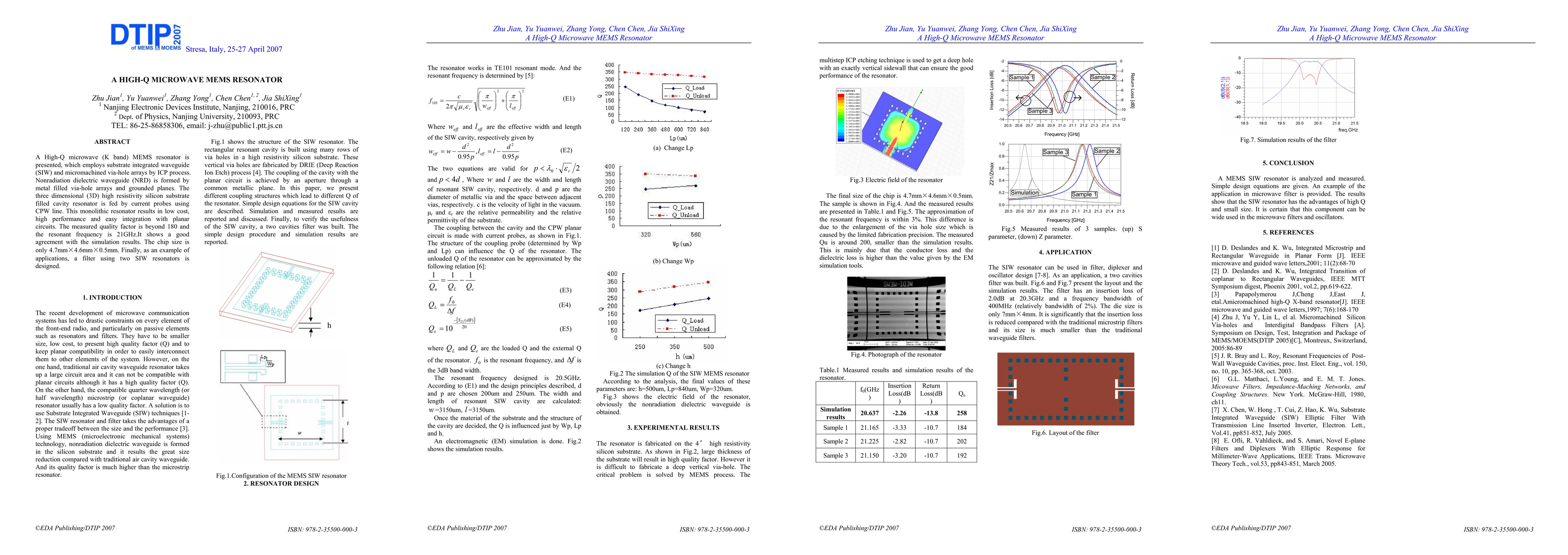 A High-Q microwave (K band) MEMS resonator is presented, which empolys substrate integrated waveguide (SIW) and micromachined via-hole arrays by ICP process. Nonradiation dielectric waveguide (NRD) is formed by metal filled via-hole arrays and grounded planes. The three dimensional (3D) high resistivity silicon substrate filled cavity resonator is fed by current probes using CPW line. This monolithic resonator results in low cost, high performance and easy integration with planar cicuits. The measured quality factor is beyond 180 and the resonance frequency is 21GHz.It shows a good agreement with the simulation results. The chip size is only 4.7mm x 4.6mm x 0.5mm. Finally, as an example of applications, a filter using two SIW resonators is designed.