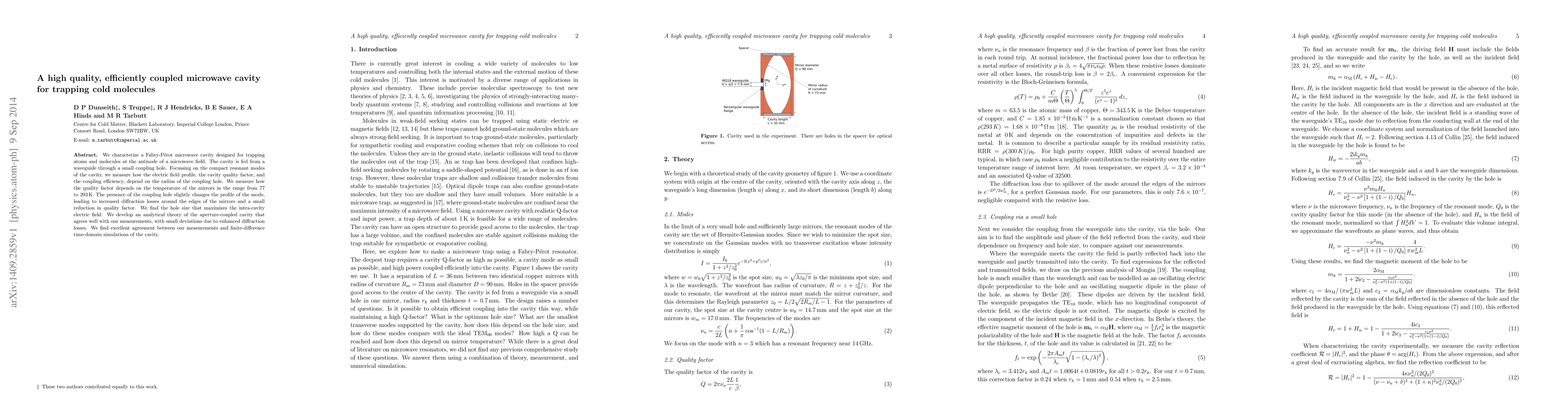 This paper characterizes a Fabry-Perot microwave cavity for trapping cold atoms and molecules, optimizing its coupling efficiency and quality factor by varying the coupling hole size. Analytical and simulation models confirm the cavity's performance, highlighting the trade-off between electric field enhancement and diffraction losses.