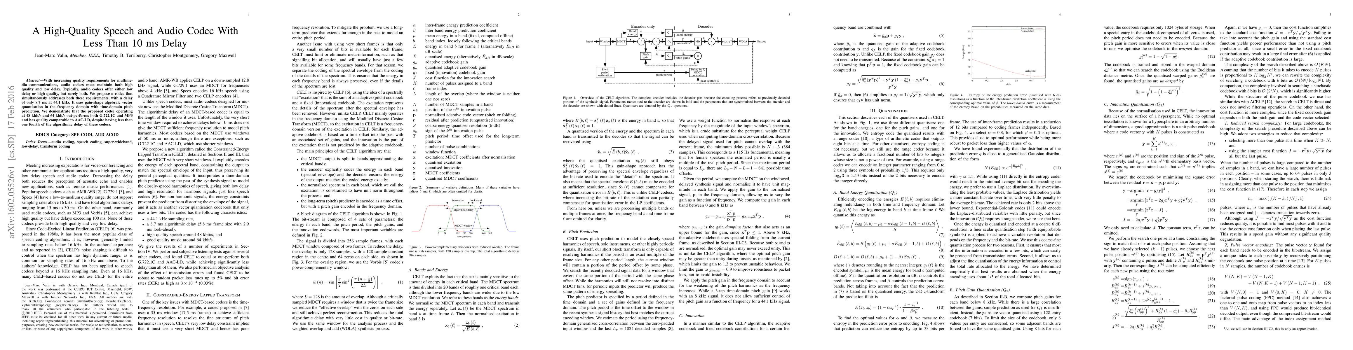 This paper proposes a high-quality speech and audio codec with a delay of only 8.7 ms, achieving superior performance compared to G.722.1C, MP3, and AAC-LD at 48 kbit/s and 64 kbit/s, while maintaining significantly lower algorithmic delay.