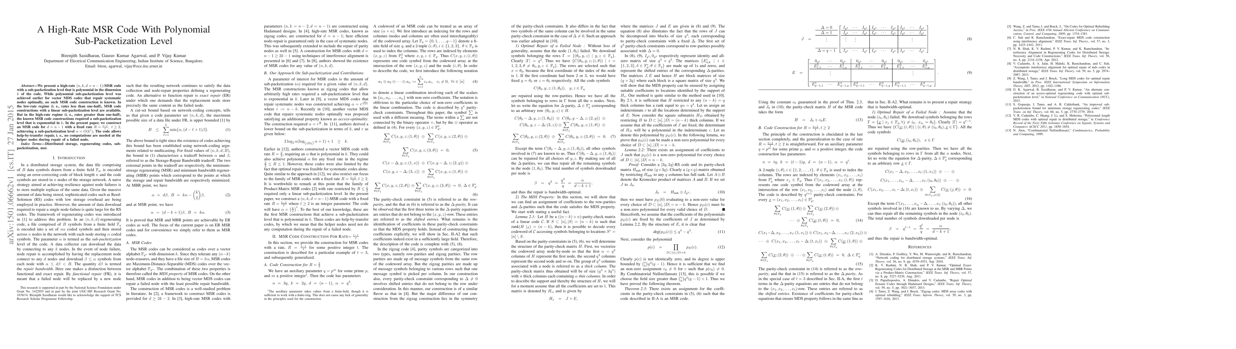 We present a high-rate $(n,k,d=n-1)$-MSR code with a sub-packetization level that is polynomial in the dimension $k$ of the code. While polynomial sub-packetization level was achieved earlier for vector MDS codes that repair systematic nodes optimally, no such MSR code construction is known. In the low-rate regime (i. e., rates less than one-half), MSR code constructions with a linear sub-packetization level are available. But in the high-rate regime (i. e., rates greater than one-half), the known MSR code constructions required a sub-packetization level that is exponential in $k$. In the present paper, we construct an MSR code for $d=n-1$ with a fixed rate $R=\frac{t-1}{t}, \ t \geq 2,$ achieveing a sub-packetization level $\alpha = O(k^t)$. The code allows help-by-transfer repair, i. e., no computations are needed at the helper nodes during repair of a failed node.