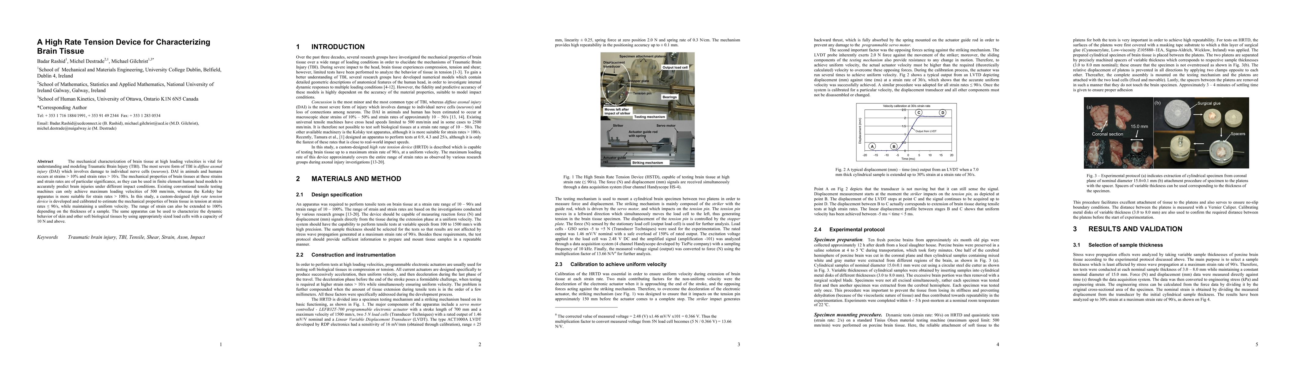 This paper presents a custom-designed high rate tension device for characterizing brain tissue mechanical properties at strain rates up to 90/s, crucial for understanding Traumatic Brain Injury. The device can extend strain to 100% and is adaptable for testing skin and other soft tissues.