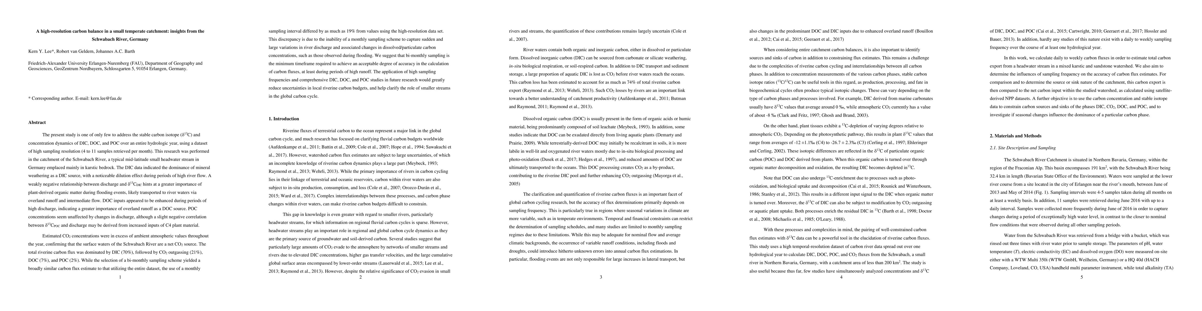 This study examines stable carbon isotope (d13C) and concentration dynamics of DIC, DOC, and POC over an entire year, using a high resolution dataset. This research was performed in the catchment of the Schwabach River, a small, karstic headwater stream in Germany. The DIC data indicated the dominance of mineral weathering as a DIC source, with a dilution effect during high flow periods. A weakly negative relationship between discharge and d13CDIC indicates an increase in plant-derived organic matter during floods, transported to river waters via overland runoff and intermediate flow. DOC inputs were enhanced during periods of high discharge, indicating a greater importance of overland runoff as a DOC source. POC concentrations seem unaffected by discharge, but a slight negative correlation between d13CPOC and discharge may be derived from increased C4 plant material inputs. CO2 concentrations exceeded ambient atmospheric values throughout the year, confirming that the river surface waters are a net CO2 source. The total riverine carbon flux was dominated by DIC (70%), followed by CO2 efflux (21%), DOC (7%), and POC (2%). While a bi-monthly sampling scheme yielded a similar carbon flux estimate to that utilizing the entire dataset, the use of a monthly sampling interval differed by up to 19%. This discrepancy is due to the inability of a monthly sampling scheme to capture sudden and large variations in river discharge and associated dissolved/particulate carbon concentration changes, such as those observed during flooding. Bi-monthly sampling may be the minimum timeframe required for an acceptable degree of accuracy in carbon flux calculations. The application of high sampling frequencies and comprehensive DIC, DOC, and POC studies in future research would reduce uncertainties in riverine carbon budgets, and clarify the role of small streams in the global carbon cycle.