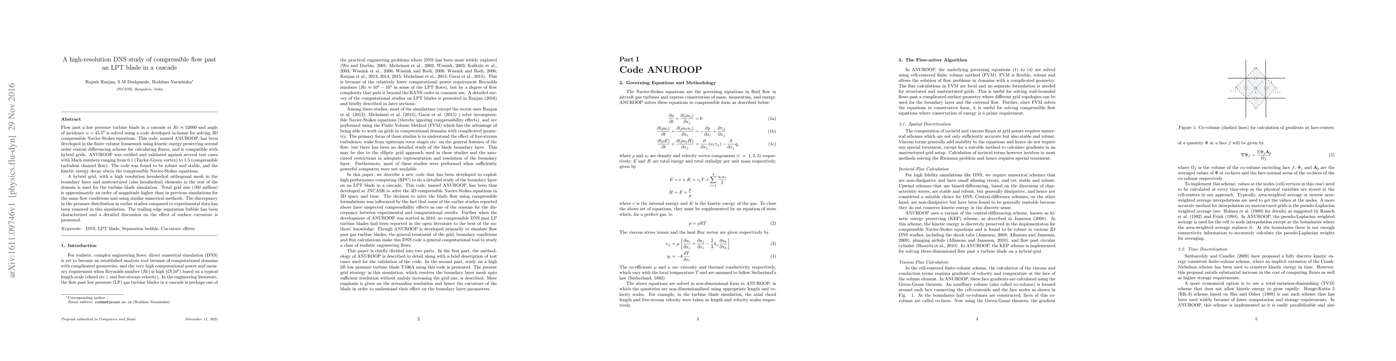 Flow past a low pressure turbine blade in a cascade at $Re \approx 52000$ and angle of incidence $\alpha = 45.5^{0}$ is solved using a code developed in-house for solving 3D compressible Navier-Stokes equations. This code, named ANUROOP, has been developed in the finite volume framework using kinetic energy preserving second order central differencing scheme for calculating fluxes, and is compatible with hybrid grids. ANUROOP was verified and validated against several test cases with Mach numbers ranging from 0.1 (Taylor-Green vortex) to 1.5 (compressible turbulent channel flow). The code was found to be robust and stable, and the kinetic energy decay obeys the compressible Navier-Stokes equations. A hybrid grid, with a high resolution hexahedral orthogonal mesh in the boundary layer and unstructured (also hexahedral) elements in the rest of the domain, is used for the turbine blade simulation. Total grid size (160 million) is approximately an order of magnitude higher than in previous simulations for the same flow conditions and using similar numerical methods. The discrepancy in the pressure distribution in earlier studies compared to experimental data has been removed in this simulation. The trailing edge separation bubble has been characterized and a detailed discussion on the effect of surface curvature is presented.