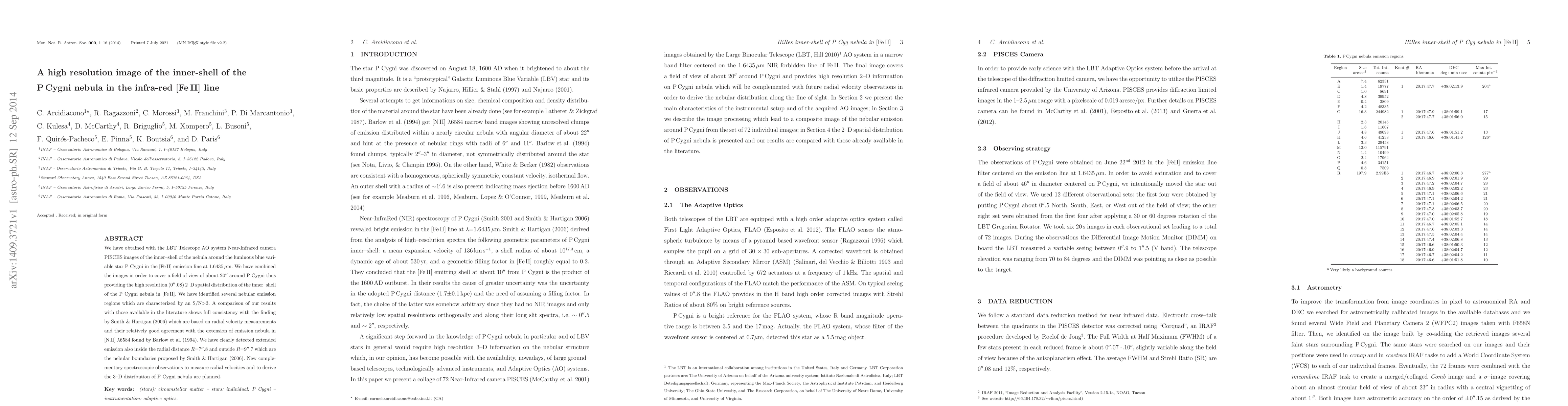 We have obtained with the LBT Telescope AO system Near-Infrared camera PISCES images of the inner-shell of the nebula around the luminous blue variable star P Cygni in the [Fe II] emission line at 1.6435 {\mu}m. We have combined the images in order to cover a field of view of about 20" around P Cygni thus providing the high resolution (0".08) 2-D spatial distribution of the inner-shell of the P Cygni nebula in [Fe II]. We have identified several nebular emission regions which are characterized by an S/N>3. A comparison of our results with those available in the literature shows full consistency with the finding by Smith & Hartigan (2006) which are based on radial velocity measurements and their relatively good agreement with the extension of emission nebula in [NII] {\lambda}6584 found by Barlow et al. (1994). We have clearly detected extended emission also inside the radial distance R=7".8 and outside R=9".7 which are the nebular boundaries proposed by Smith & Hartigan (2006). New complementary spectroscopic observations to measure radial velocities and to derive the 3-D distribution of P Cygni nebula are planned.
