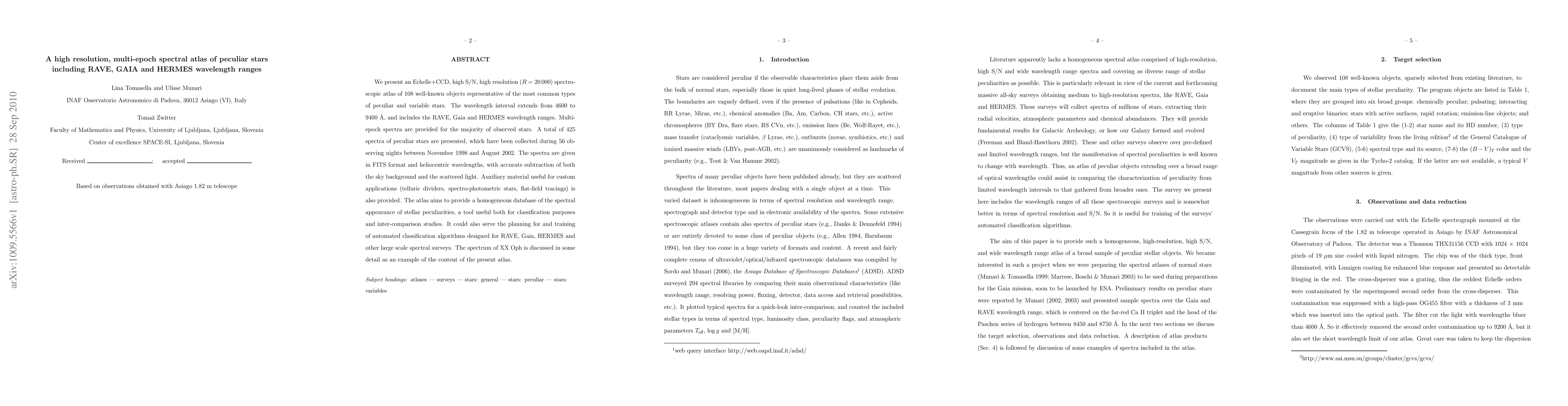 This paper presents a high-resolution spectral atlas of 108 peculiar stars, covering wavelengths from 4600 to 9400 Angstroms, including ranges for RAVE, Gaia, and HERMES surveys. It offers 425 multi-epoch spectra collected over 56 observing nights, aiming to provide a homogeneous database for classification, inter-comparison studies, and automated algorithm training for large spectral surveys. The atlas also includes auxiliary material for custom applications.