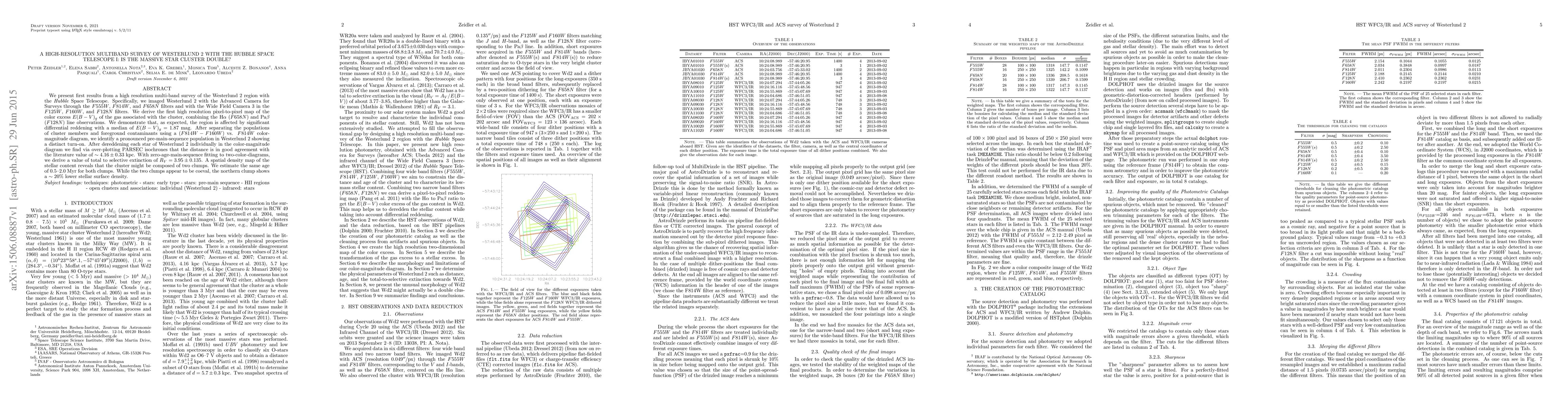 We present first results from a high resolution multi-band survey of the Westerlund 2 region with the Hubble Space Telescope. Specifically, we imaged Westerlund 2 with the Advanced Camera for Surveys through the $F555W$, $F814W$, and $F658N$ filters and with the Wide Field Camera 3 in the $F125W$, $F160W$, and $F128N$ filters. We derive the first high resolution pixel-to-pixel map of the color excess $E(B-V)_g$ of the gas associated with the cluster, combining the H$\alpha$ ($F658N$) and Pa$\beta$ ($F128N$) line observations. We demonstrate that, as expected, the region is affected by significant differential reddening with a median of $E(B-V)_g=1.87$~mag. After separating the populations of cluster members and foreground contaminants using a $(F814W-F160W)$ vs. $F814W$ color-magnitude diagram, we identify a pronounced pre-main-sequence population in Westerlund 2 showing a distinct turn-on. After dereddening each star of Westerlund 2 individually in the color-magnitude diagram we find via over-plotting PARSEC isochrones that the distance is in good agreement with the literature value of $\sim4.16 \pm 0.33$~kpc. With zero-age-main-sequence fitting to two-color-diagrams, we derive a value of total to selective extinction of $R_V=3.95 \pm 0.135$. A spatial density map of the stellar content reveals that the cluster might be composed of two clumps. We estimate the same age of 0.5-2.0 Myr for both clumps. While the two clumps appear to be coeval, the northern clump shows a $\sim 20 \%$ lower stellar surface density.