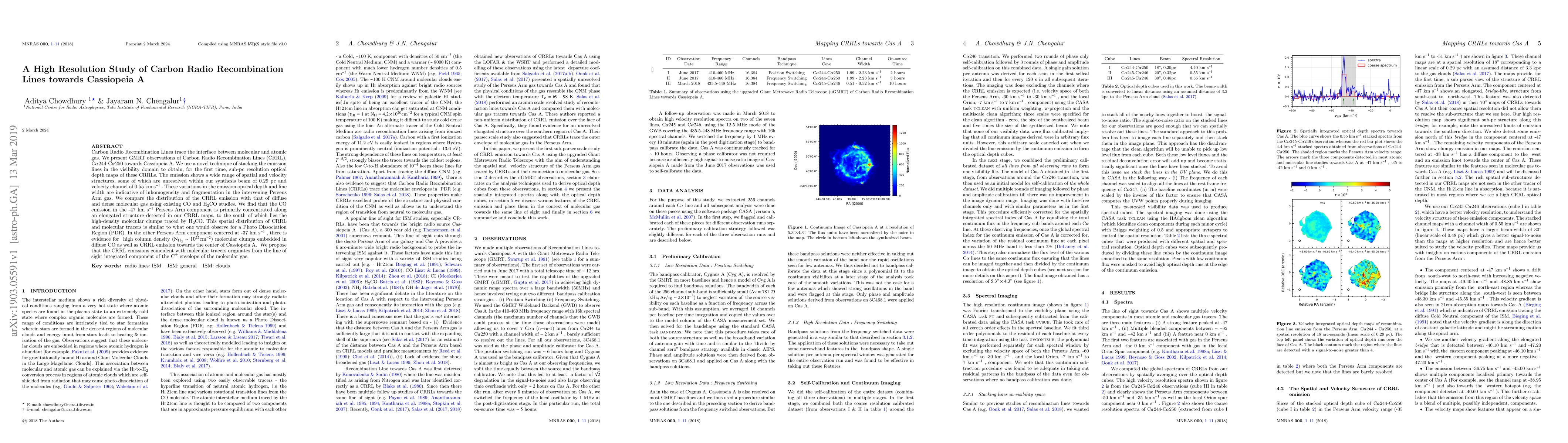 Carbon Radio Recombination Lines trace the interface between molecular and atomic gas. We present GMRT observations of Carbon Radio Recombination Lines (CRRL), C$\alpha$244-C$\alpha$250 towards Cassiopeia A. We use a novel technique of stacking the emission lines in the visibility domain to obtain, for the first time, sub-pc resolution optical depth maps of these CRRLs. The emission shows a wide range of spatial and velocity structures, some of which are unresolved within our synthesis beam of 0.29 pc and velocity channel of 0.55 km/s. These variations in the emission optical depth and line width are indicative of inhomogeneity and fragmentation in the intervening Perseus Arm gas. We compare the distribution of the CRRL emission with that of diffuse and dense molecular gas using existing CO and H$_2$CO studies. We find that the CO emission in the -47 km/s Perseus Arm component is primarily concentrated along an elongated structure detected in our CRRL maps, to the south of which lies the high-density molecular clumps traced by H$_2$CO. This spatial distribution of CRRL and molecular tracers is similar to what one would observe for a Photo Dissociation Region (PDR). In the other Perseus Arm component centered at -37 km/s, there is evidence for high column density (N$_{H_2}$ ~ $10^{22}$cm$^{-2}$) molecular clumps embedded in diffuse CO as well as CRRL emission towards the center of Cassiopeia A. We propose that the CRRL emissions coincident with molecular tracers originates from the line of sight integrated component of the C$^{+}$ envelope of the molecular gas.