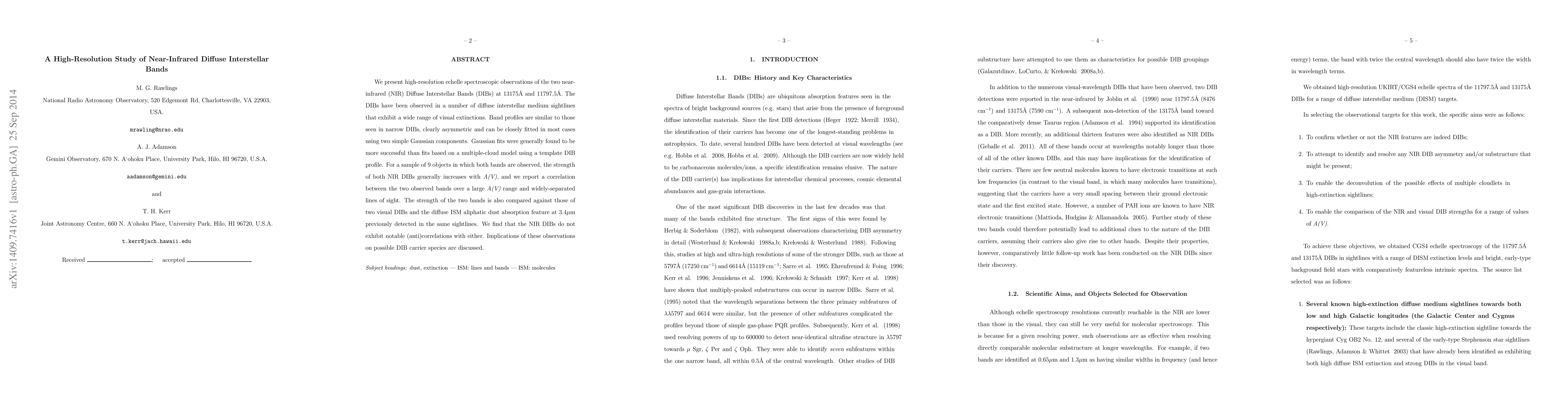 We present high-resolution echelle spectroscopic observations of the two near- infrared (NIR) Diffuse Interstellar Bands (DIBs) at 13175 A and 11797.5 A. The DIBs have been observed in a number of diffuse interstellar medium sightlines that exhibit a wide range of visual extinctions. Band profiles are similar to those seen in narrow DIBs, clearly asymmetric and can be closely fitted in most cases using two simple Gaussian components. Gaussian fits were generally found to be more successful than fits based on a multiple-cloud model using a template DIB profile. For a sample of 9 objects in which both bands are observed, the strength of both NIR DIBs generally increases with A(V), and we report a correlation between the two observed bands over a large A(V) range and widely-separated lines of sight. The strength of the two bands is also compared against those of two visual DIBs and the diffuse ISM aliphatic dust absorption feature at 3.4 microns previously detected in the same sightlines. We find that the NIR DIBs do not exhibit notable (anti)correlations with either. Implications of these observations on possible DIB carrier species are discussed.